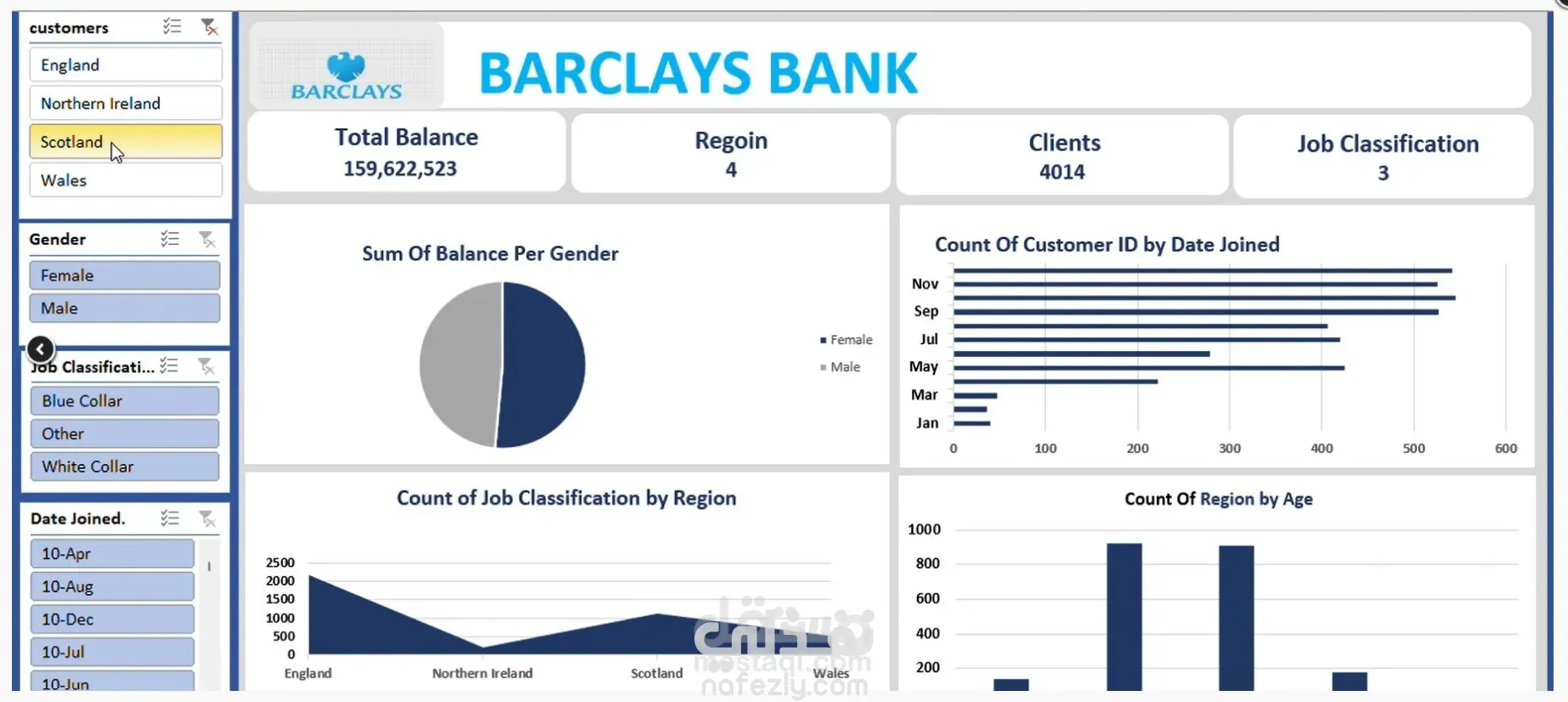 في هذا المشروع قمت بإدخال وتنظيم بيانات ضخمة تخص بنك Barclays Bank باستخدام برنامج Excel، ثم قمت بتحليلها وعرض النتائج في Dashboard تفاعلي يعرض مؤشرات الأداء الرئيسية مثل: • إجمالي الرصيد الكلي (Total Balance) • عدد العملاء (Clients) • تصنيف الوظائف (Job Classification) • توزيع الرصيد حسب النوع (Sum of Balance per Gender) • عدد العملاء حسب تاريخ الانضمام والمنطقة استخدمت في المشروع أدوات Excel المتقدمة مثل: • Pivot Tables و Pivot Charts • Data Cleaning & Validation • Interactive Filters & Slicers • تصميم واجهة Dashboard احترافية وسهلة الاستخدام النتيجة كانت لوحة معلومات ديناميكية تساعد في فهم توزيع العملاء والأرصدة وتحليل البيانات بشكل سريع ودقيق