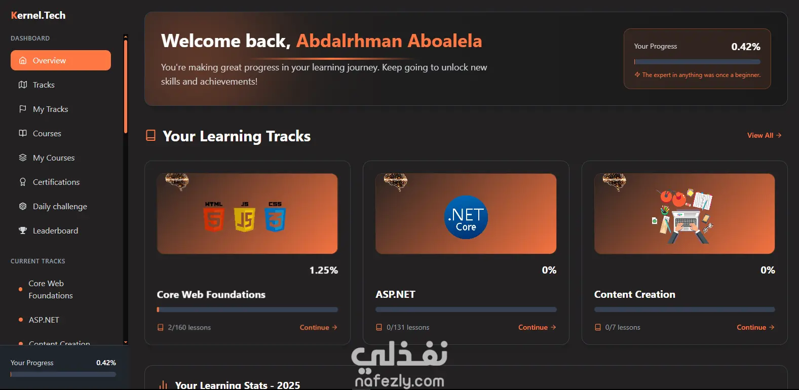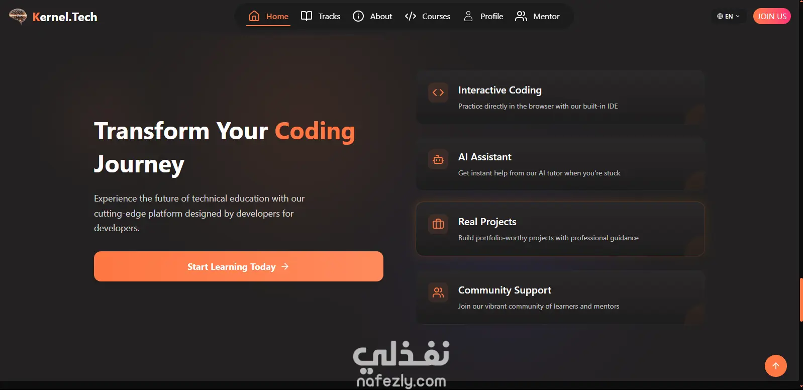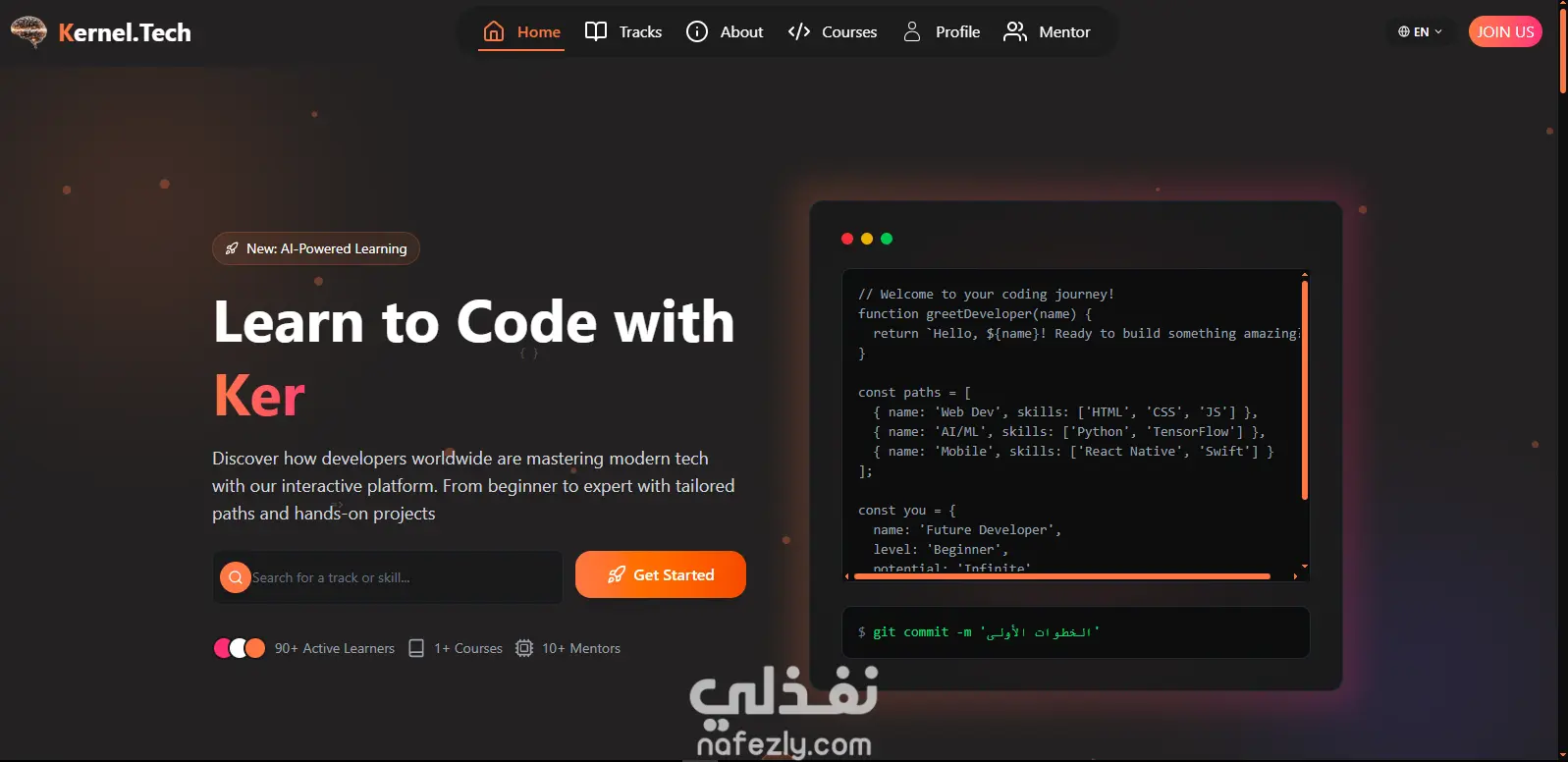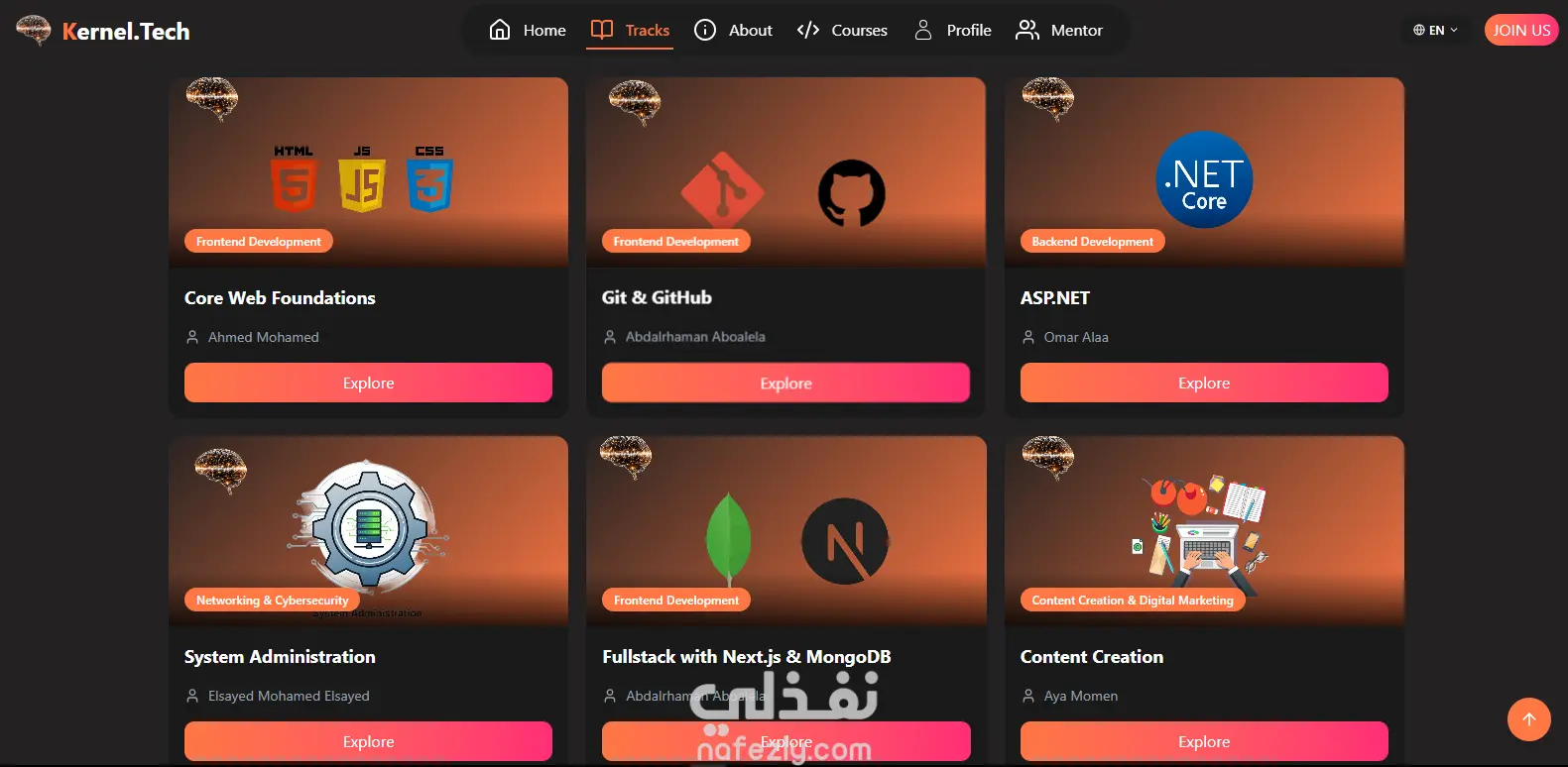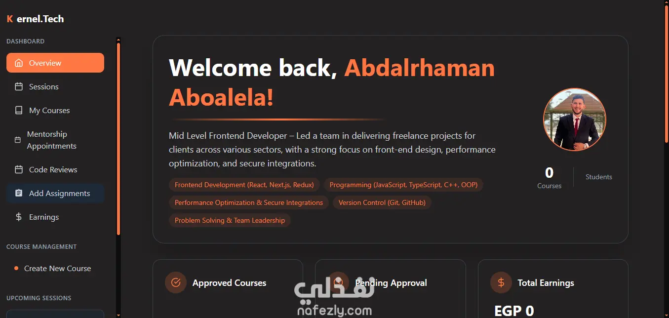 Kernel Tech – منصة تعليمية تفاعلية متكاملة الفكرة : مشروع تطوعي بدأناه في Kernel Software Solutions بهدف مساعدة الطلاب في مجال التقنية من خلال توفير خريطة تعلم منظمة (Roadmap) من مصادر مفتوحة ومجربة من مطورين محترفين. تطورت الفكرة إلى منصة تعليمية تفاعلية متكاملة تساعد المتعلمين على بناء مسار واضح وتطبيق عملي أثناء التعلم. أهم المميزات : - نظام Roadmaps واضح لتتبع التقدم مع شهادات عند الإنهاء. - داشبورد مخصصة للمدرسين لإدارة الكورسات (مسجلة أو لايف). - نظام اشتراكات مدفوعة يتيح جلسات Mentorship 1:1 بحجز تلقائي من Calendar + Zoom. - إمكانية إرسال الأكواد للمراجعة (Code Review) من المينتور المختار. - تحديات يومية + نظام نقاط + لوحة ترتيب (Leaderboard). - دعم الذكاء الاصطناعي لتقييم الحلول وتصحيحها. - تعدد الأدوار (Admin – Instructor – Student) مع صلاحيات مختلفة. - دعم تسجيل الدخول عبر GitHub Auth و Gmail. التقنيات المستخدمة : - Frontend: Angular 18 (Standalone, Signals, Angular Materials, Chart.js)، Next.js 15، Tailwind، React Query، React Calendar، Framer Motion، Zod. - Backend : Laravel، JWT Auth، MySQL. - Integrations: Zoom API، Gmail API، GitHub Auth، نظام تقييم بالذكاء الاصطناعي. رابط المنصة : [https://kerneltech.site]