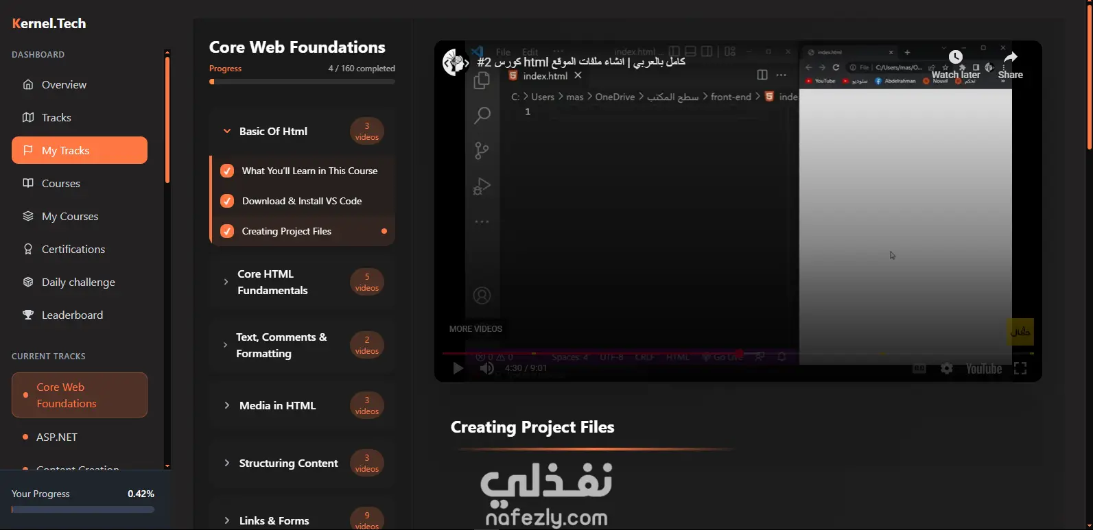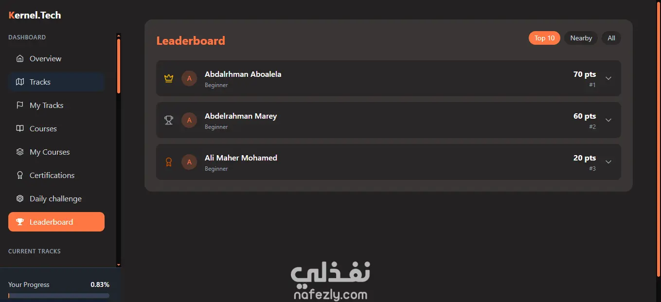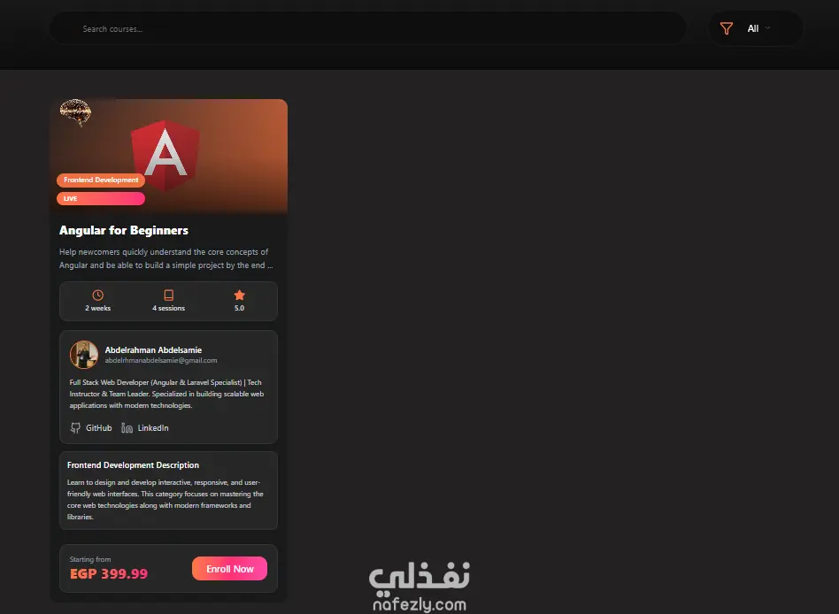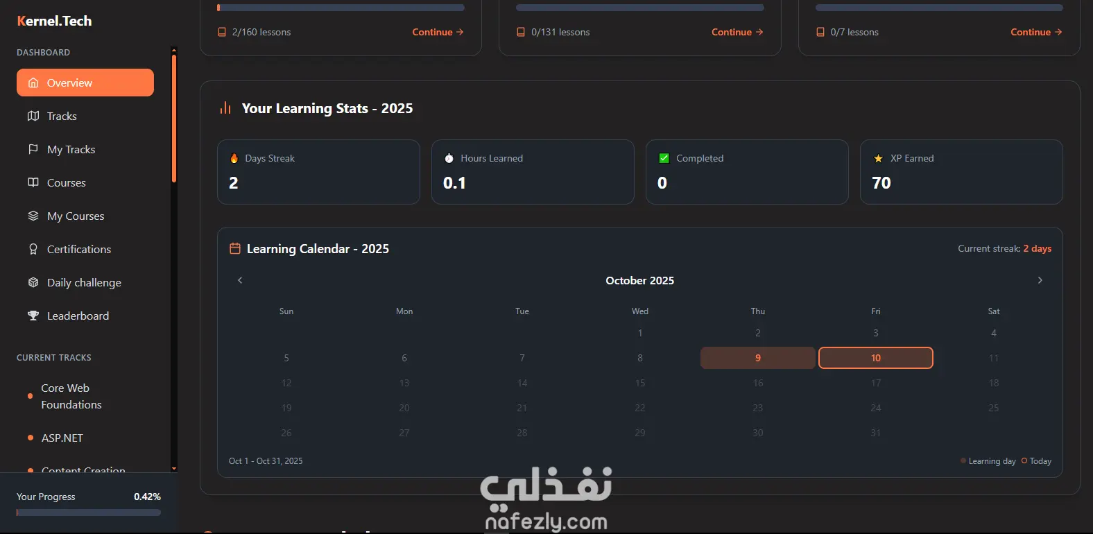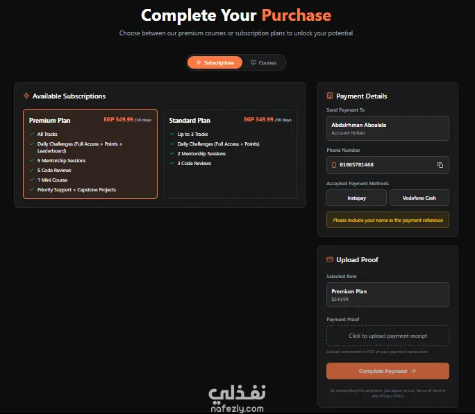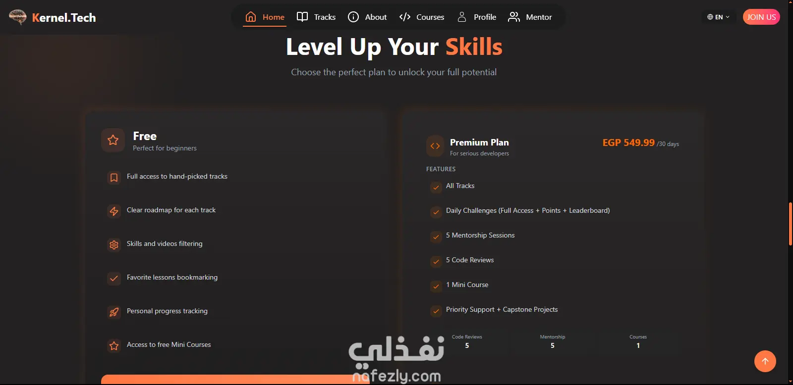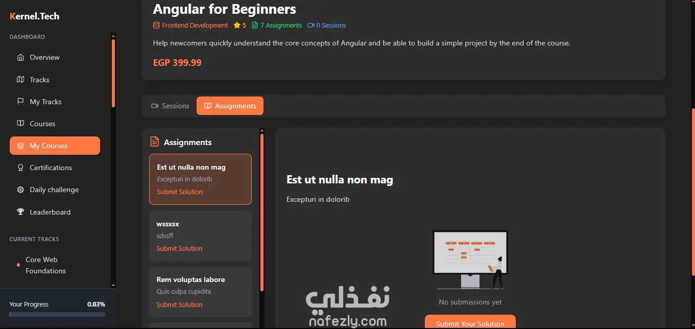 Kernel Tech – منصة تعليمية تفاعلية متكاملة الفكرة : مشروع تطوعي بدأناه في Kernel Software Solutions بهدف مساعدة الطلاب في مجال التقنية من خلال توفير خريطة تعلم منظمة (Roadmap) من مصادر مفتوحة ومجربة من مطورين محترفين. تطورت الفكرة إلى منصة تعليمية تفاعلية متكاملة تساعد المتعلمين على بناء مسار واضح وتطبيق عملي أثناء التعلم. أهم المميزات : - نظام Roadmaps واضح لتتبع التقدم مع شهادات عند الإنهاء. - داشبورد مخصصة للمدرسين لإدارة الكورسات (مسجلة أو لايف). - نظام اشتراكات مدفوعة يتيح جلسات Mentorship 1:1 بحجز تلقائي من Calendar + Zoom. - إمكانية إرسال الأكواد للمراجعة (Code Review) من المينتور المختار. - تحديات يومية + نظام نقاط + لوحة ترتيب (Leaderboard). - دعم الذكاء الاصطناعي لتقييم الحلول وتصحيحها. - تعدد الأدوار (Admin – Instructor – Student) مع صلاحيات مختلفة. - دعم تسجيل الدخول عبر GitHub Auth و Gmail. التقنيات المستخدمة : - Frontend: Angular 18 (Standalone, Signals, Angular Materials, Chart.js)، Next.js 15، Tailwind، React Query، React Calendar، Framer Motion، Zod. - Backend : Laravel، JWT Auth، MySQL. - Integrations: Zoom API، Gmail API، GitHub Auth، نظام تقييم بالذكاء الاصطناعي. رابط المنصة : [https://kerneltech.site]