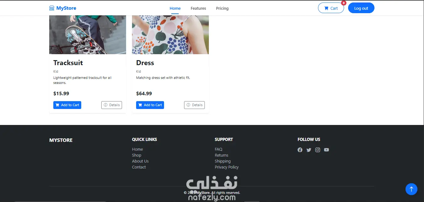 MyStore هو تطبيق ويب لمتجر إلكتروني تم تطويره باستخدام HTML, CSS, JavaScript, Bootstrap. يتميز بـ: تصميم عصري متجاوب يدعم كل الشاشات مكونات قابلة لإعادة الاستخدام (Reusable Components) بنية منظمة Modular Architecture تفاعل ديناميكي (مثلاً إضافة المنتجات إلى السلة، عرض التفاصيل) صفحات مثل الصفحة الرئيسية، صفحة المنتج، صفحة السلة checkout، إلخ كود نظيف وسهل التعديل