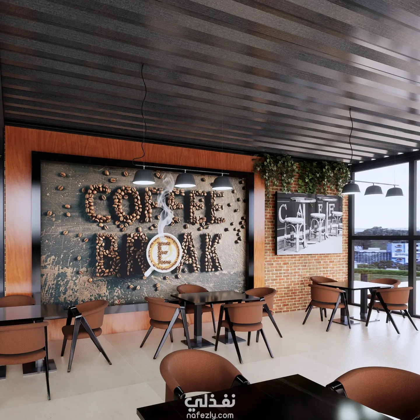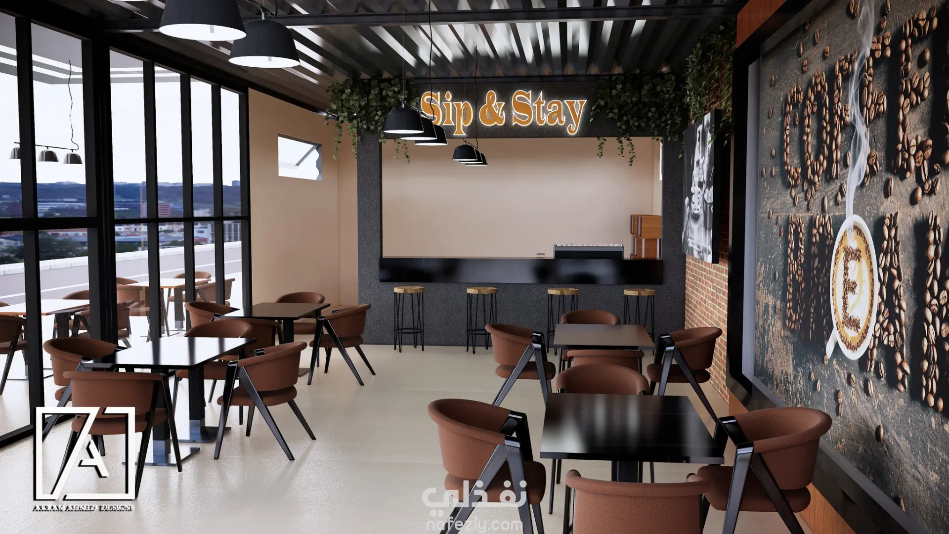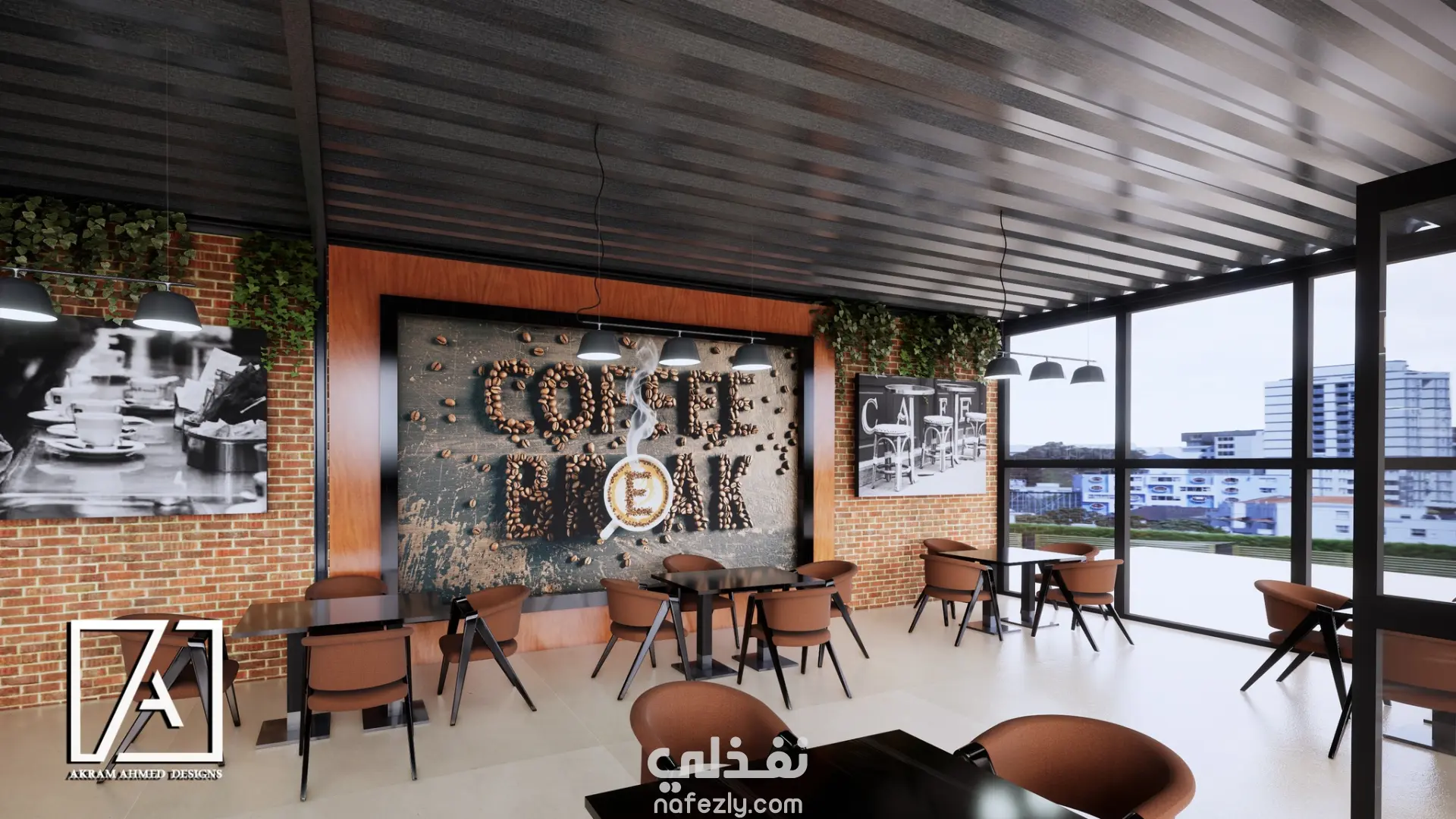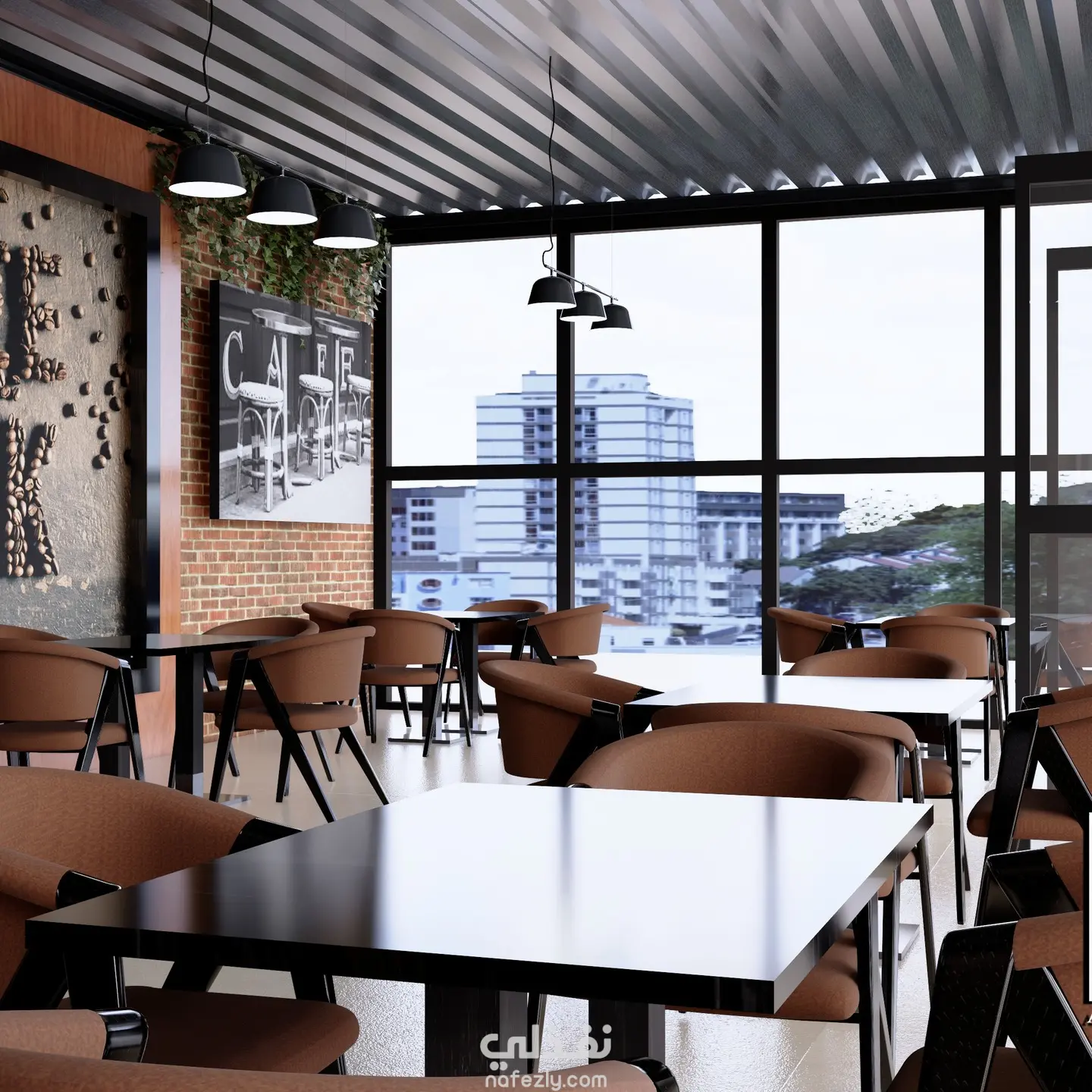 تصميم لكافتريا على الطراز الصناعي الحديث ، تجمع بين البساطة والفخامة.