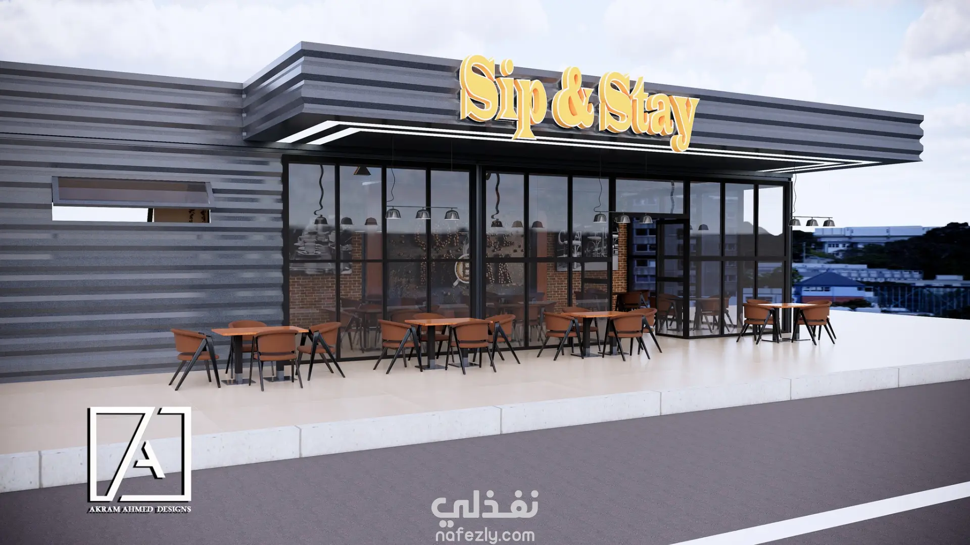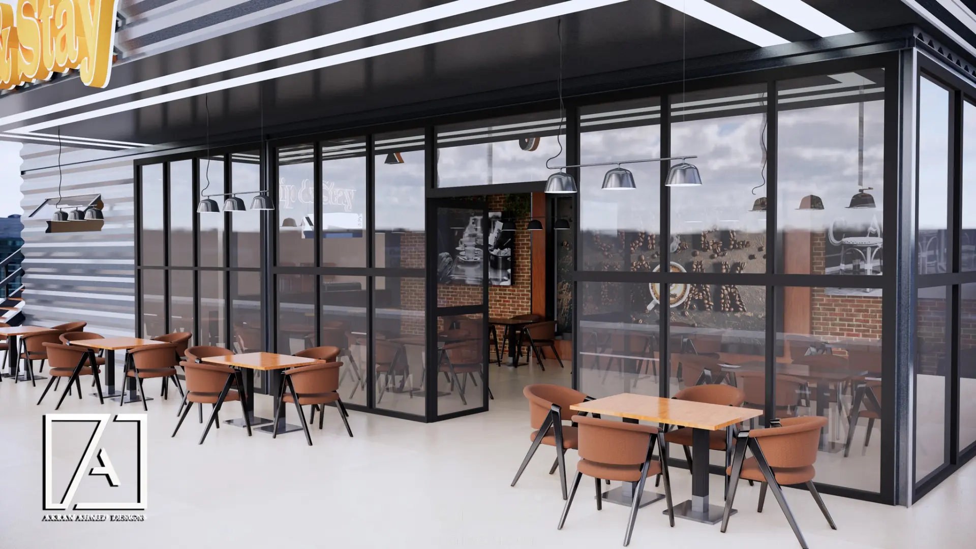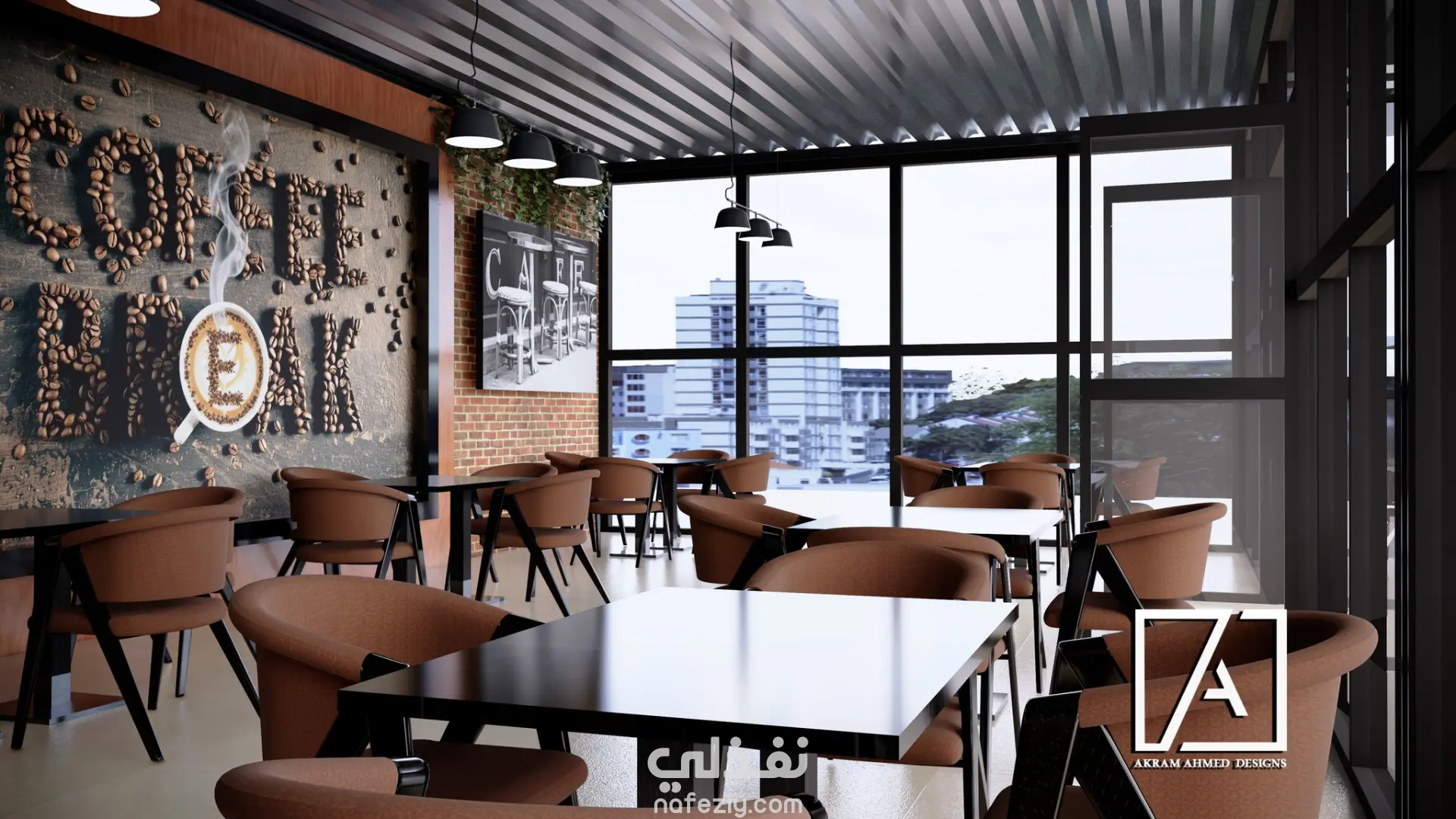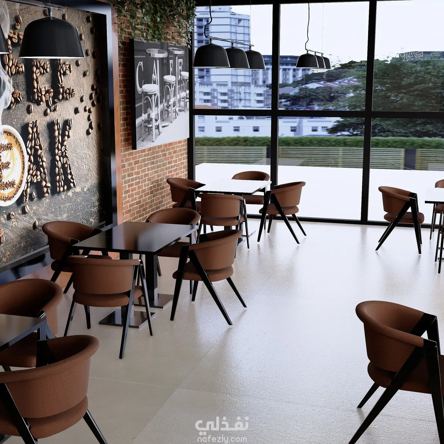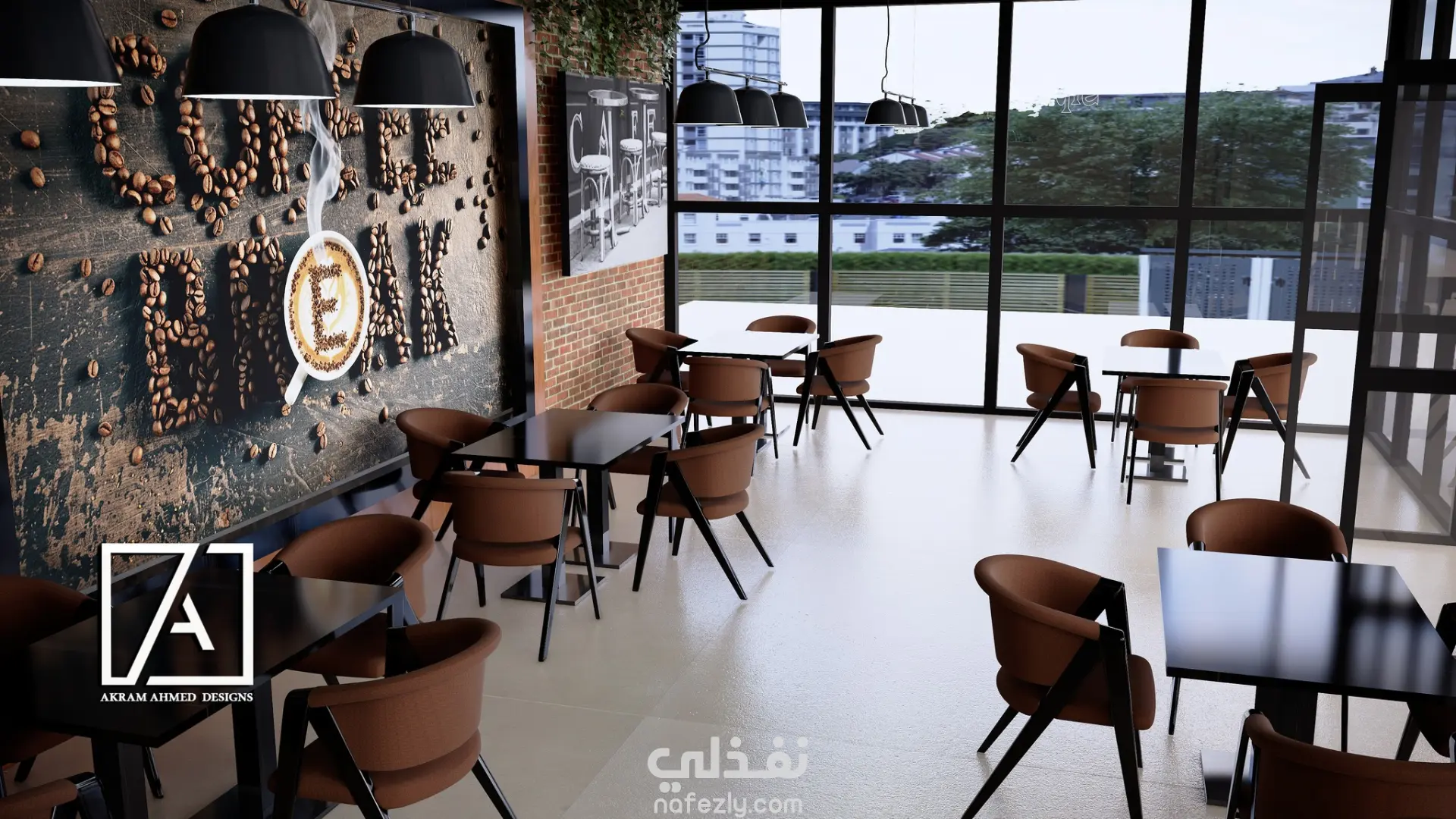 تصميم لكافتريا على الطراز الصناعي الحديث ، تجمع بين البساطة والفخامة.