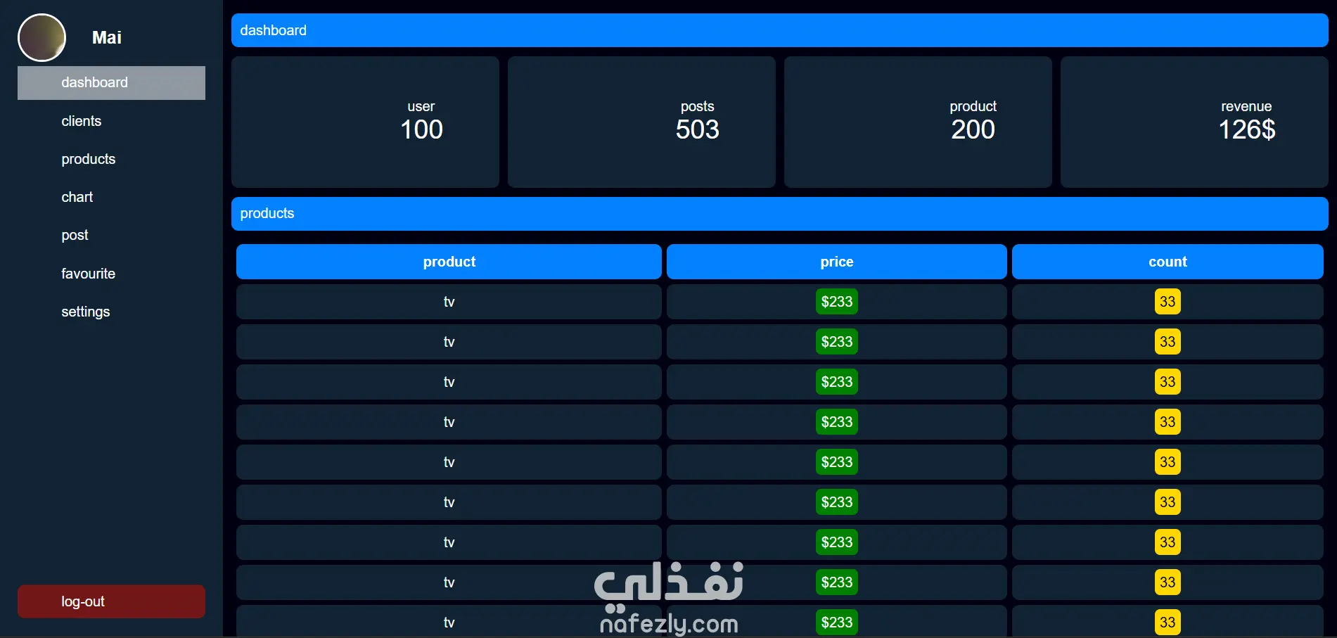 2. أقسام لإحصائيات المستخدمين والمنتجات والإيرادات.