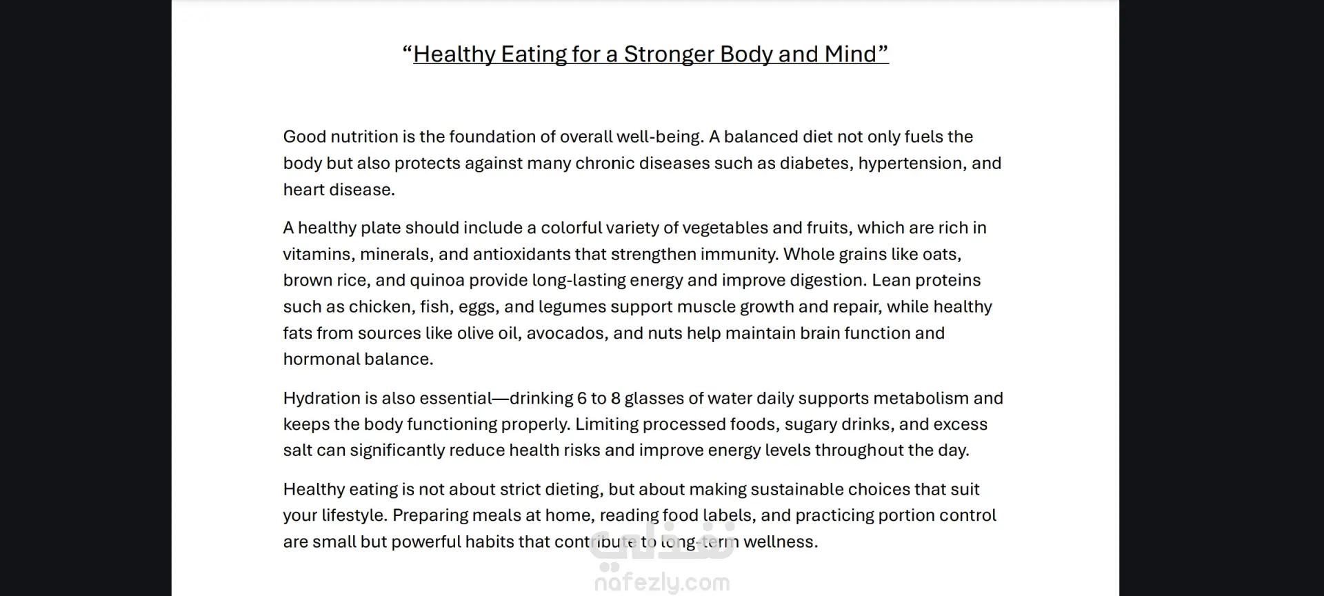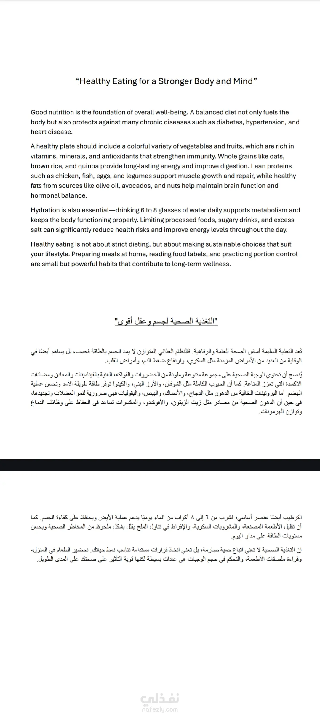I’ve written a bilingual article (English and Arabic) about the importance of balanced nutrition and healthy lifestyle choices. The piece highlights how proper nutrition supports physical and mental well-being, helps prevent chronic diseases, and promotes long-term health. The article includes practical advice on creating a balanced diet — focusing on vegetables, fruits, whole grains, lean proteins, and healthy fats — along with the importance of hydration and reducing processed foods. The Arabic version is a professional translation of the English text, ensuring both accuracy and natural readability. Purpose: This article is part of a wellness and health awareness project, aimed at encouraging readers to adopt sustainable and realistic healthy eating habits. Length: About one page per language (English & Arabic). Tone: Educational, inspiring, and easy to read.