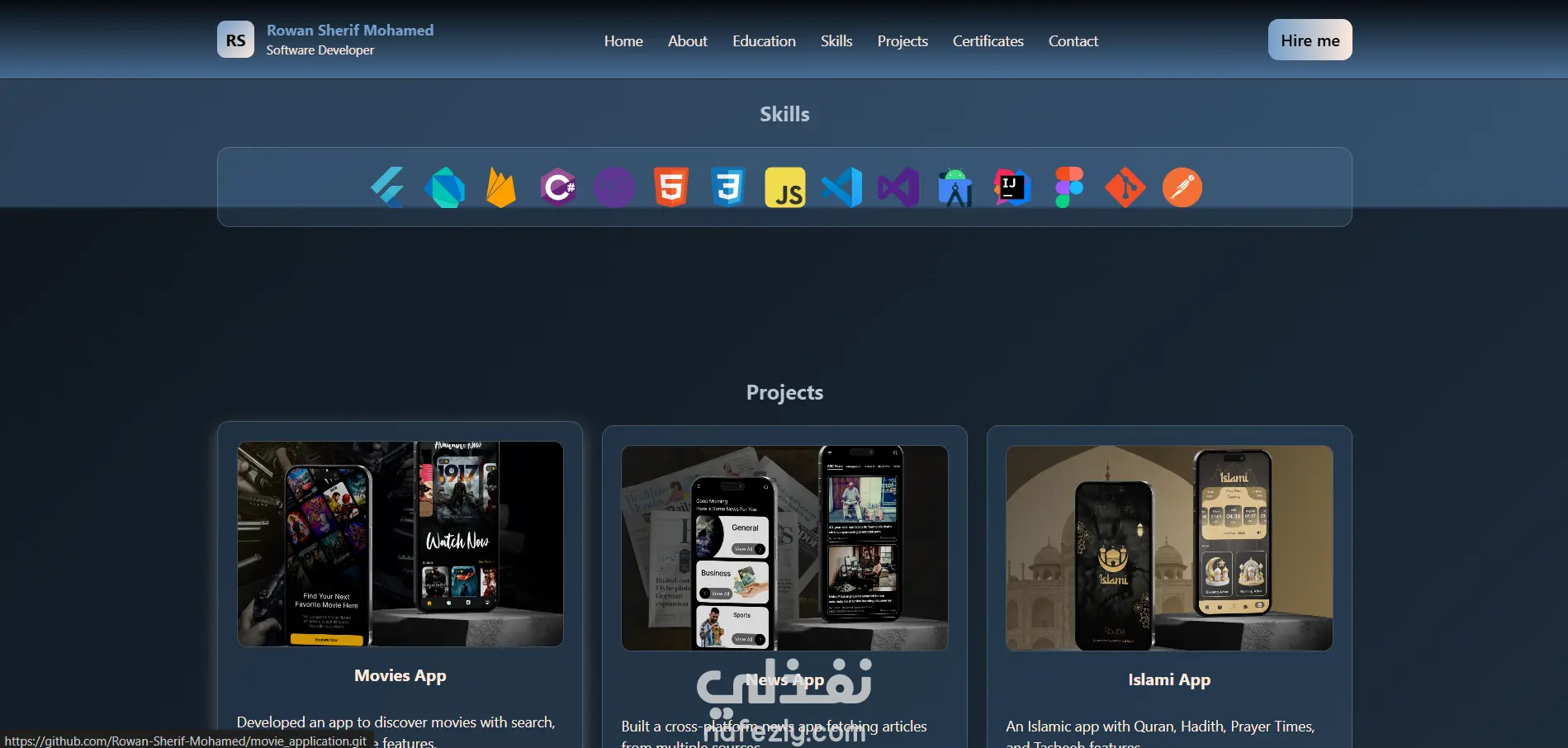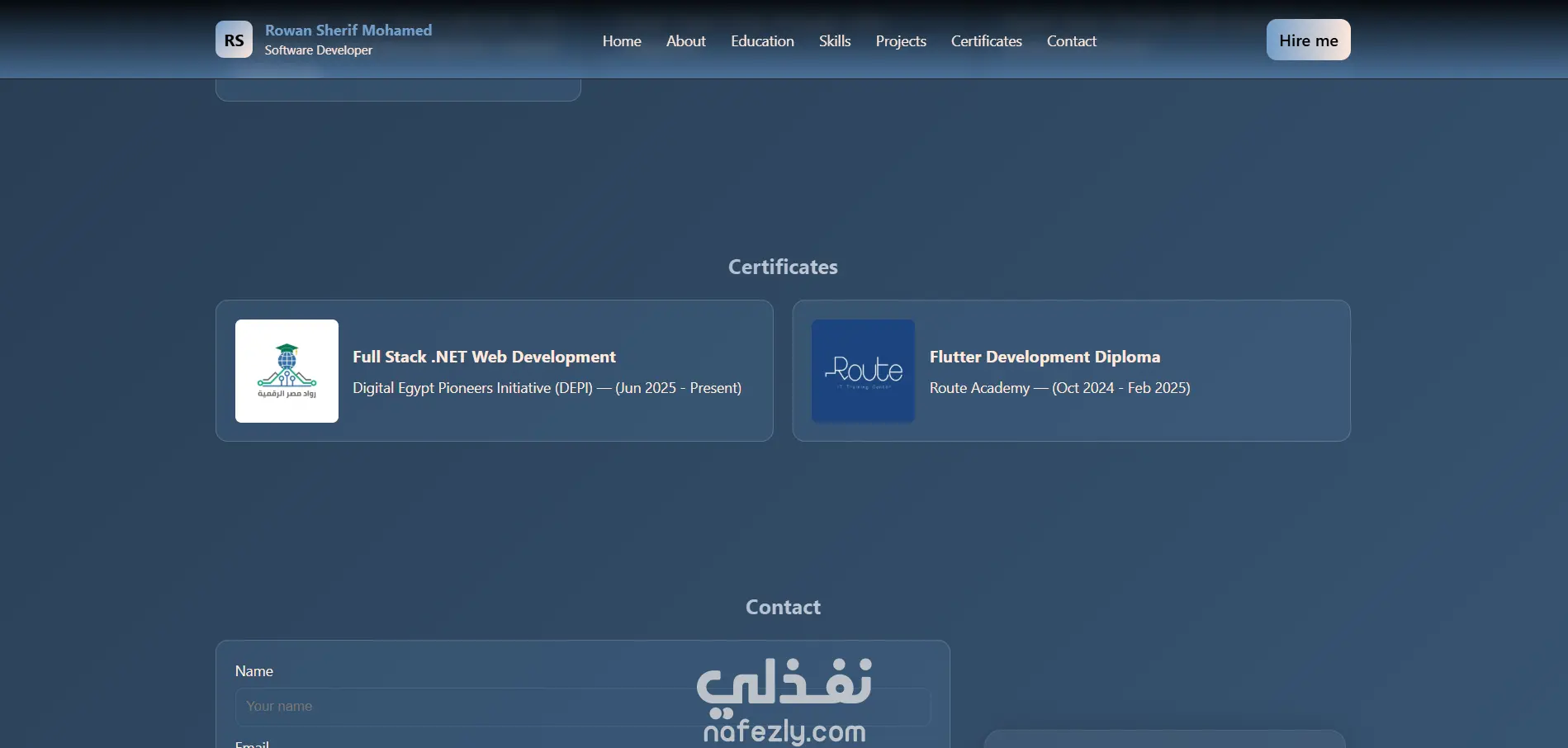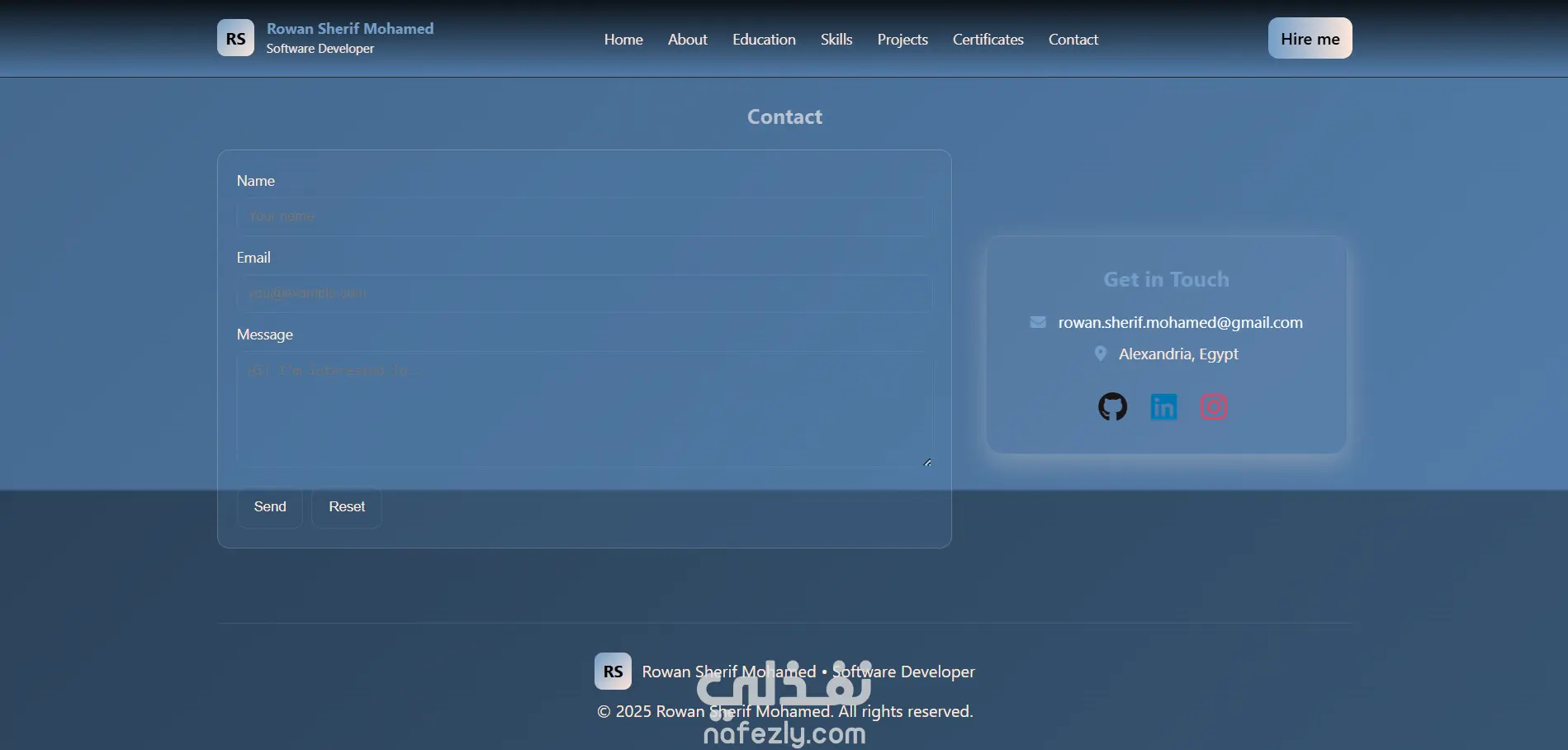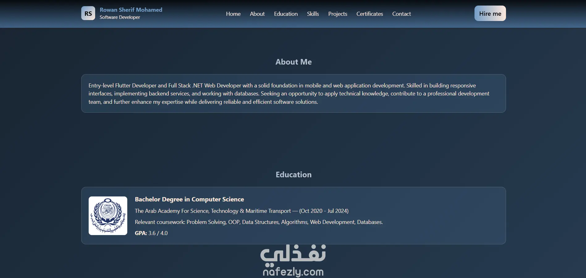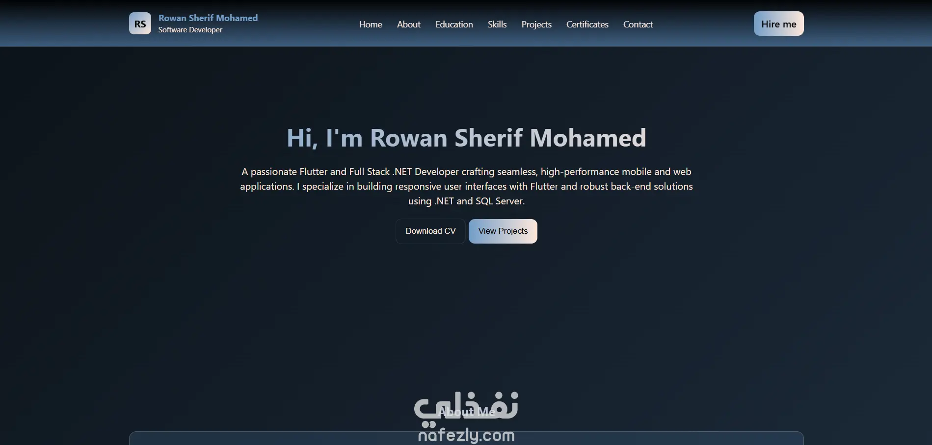 هذا المشروع هو موقعي الشخصي (Portfolio) الذي يعرض أعمالي ومهاراتي كمطورة برمجيات. تم تصميمه وتكويده بالكامل باستخدام HTML, CSS، وJavaScript ليعكس خبرتي في بناء واجهات ويب حديثة وجذابة.