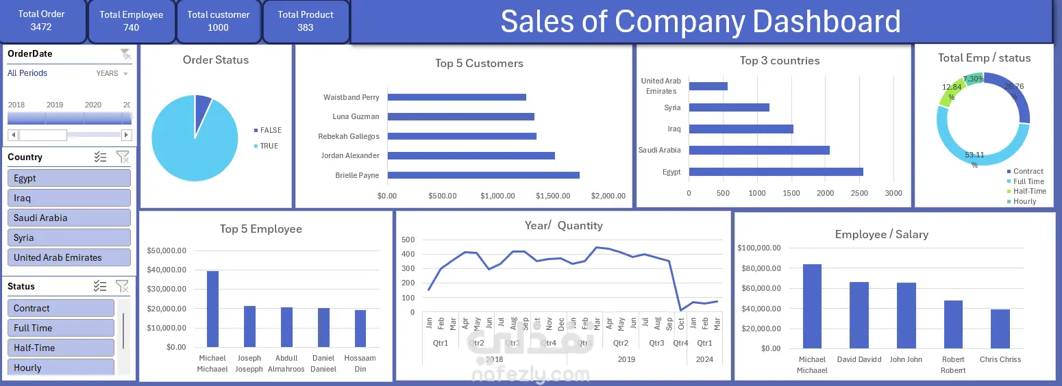 تحليل المبيعات حسب الدول، المنتجات، الموظفين والفترات الزمنية.