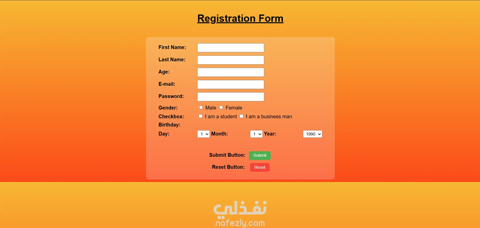 الصفحة دي تمثل نموذج تسجيل مستخدم جديد داخل نظام الجيم، معمول بتصميم عصري بسيط باستخدام HTML + CSS فقط، بألوان برتقالي متدرج لإضفاء إحساس بالطاقة والنشاط المرتبط بالرياضة واللياقة البدنية.
