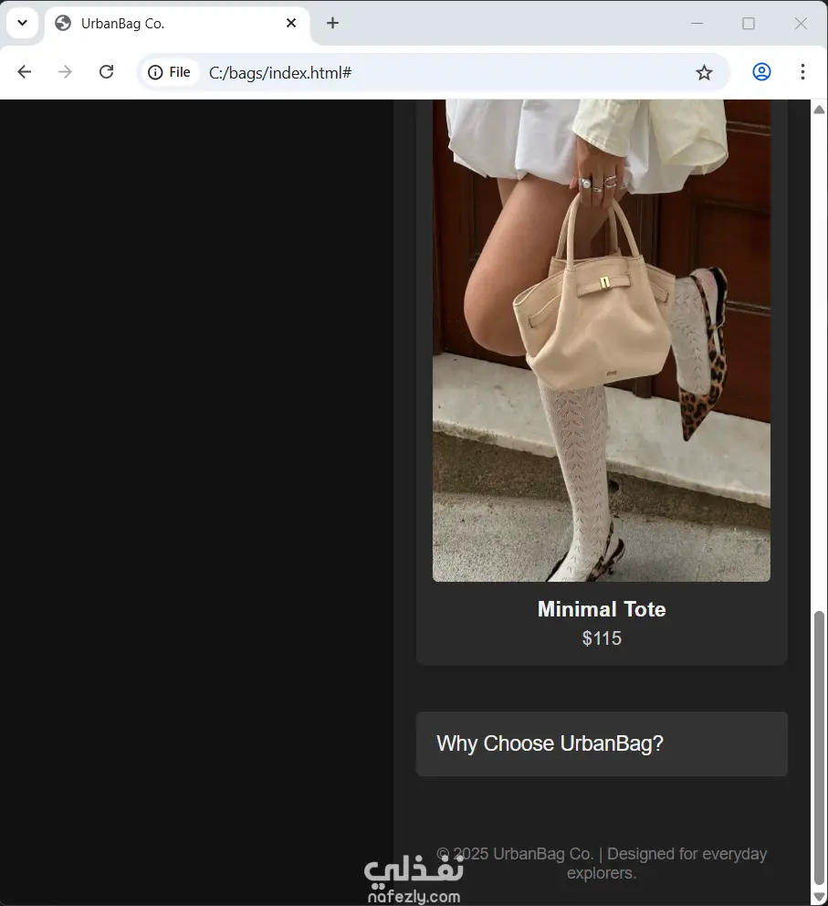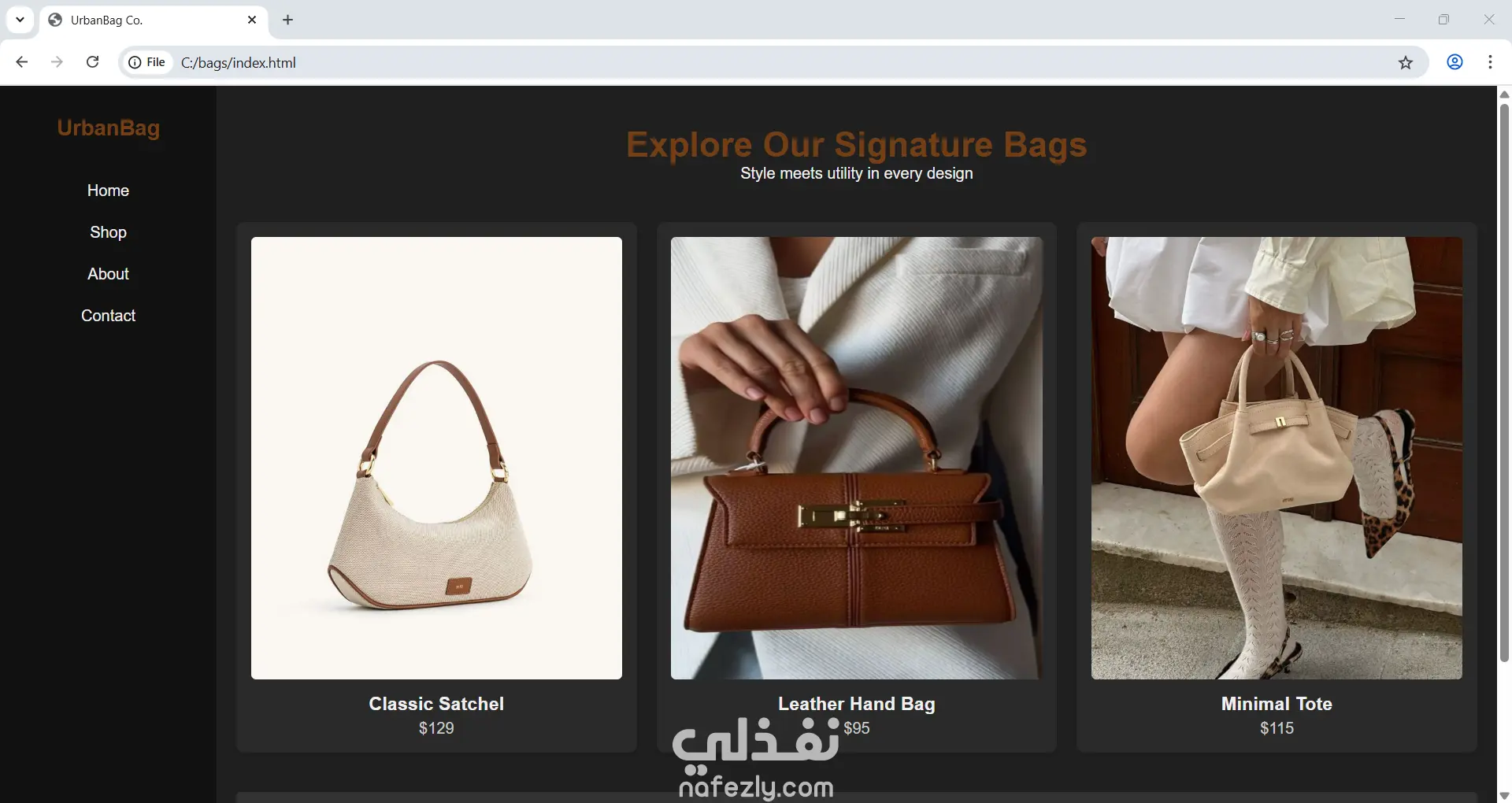 قمت بتصميم وتطوير موقع إلكتروني احترافي لعرض وبيع المنتجات (حقائب يد) باستخدام HTML, CSS, JavaScript.
