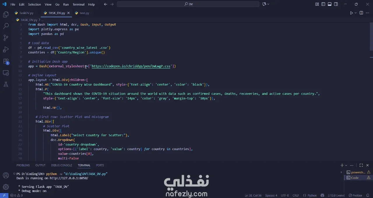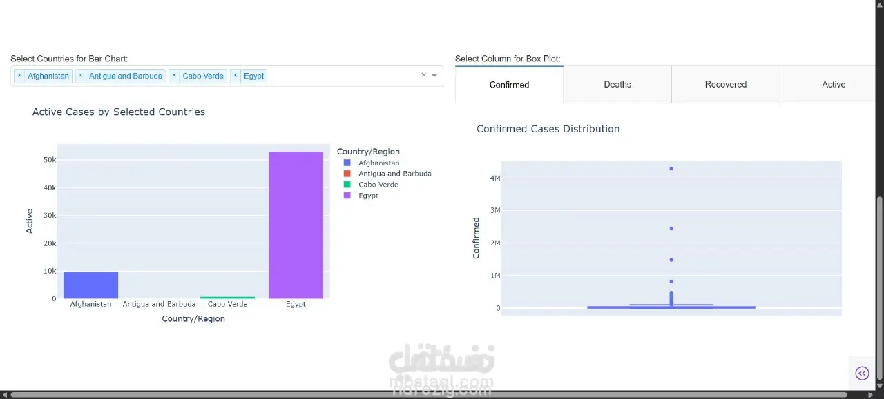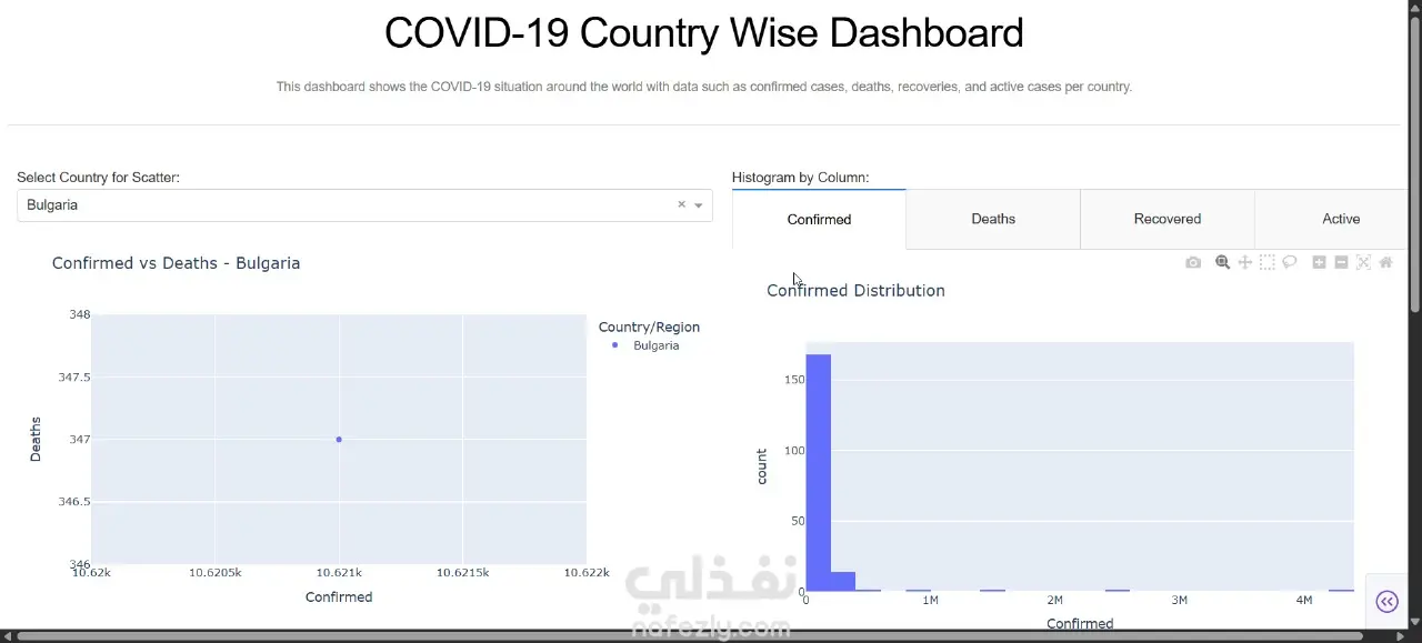 سأقوم بتطوير لوحة تحكم تفاعلية باستخدام Python و Dash و Plotly لعرض وتحليل بيانات جائحة كورونا (COVID-19) على مستوى الدول. مميزات اللوحة: ️ رسم بياني تفاعلي (Scatter Plot) يوضح العلاقة بين الحالات المؤكدة والوفيات لكل دولة ️ هيستوجرام يوضح توزيع البيانات (Confirmed, Deaths, Recovered, Active) ️ رسم بياني بالأعمدة (Bar Chart) لعرض الحالات النشطة لدول محددة ️ Box Plot يوضح توزيع القيم بين الدول ️ إمكانية اختيار الدولة أو العمود المطلوب من خلال فلاتر تفاعلية ️ تصميم منظم وسهل الاستخدام هذه اللوحة مناسبة جدًا لـ تحليل البيانات الصحية، استخراج الرؤى، واتخاذ القرارات المبنية على البيانات. المخرجات: لوحة تحكم تفاعلية كاملة كود بايثون منظم ومشروح (Dash + Plotly + Pandas) إمكانية تشغيلها محليًا أو رفعها على خادم (Server)