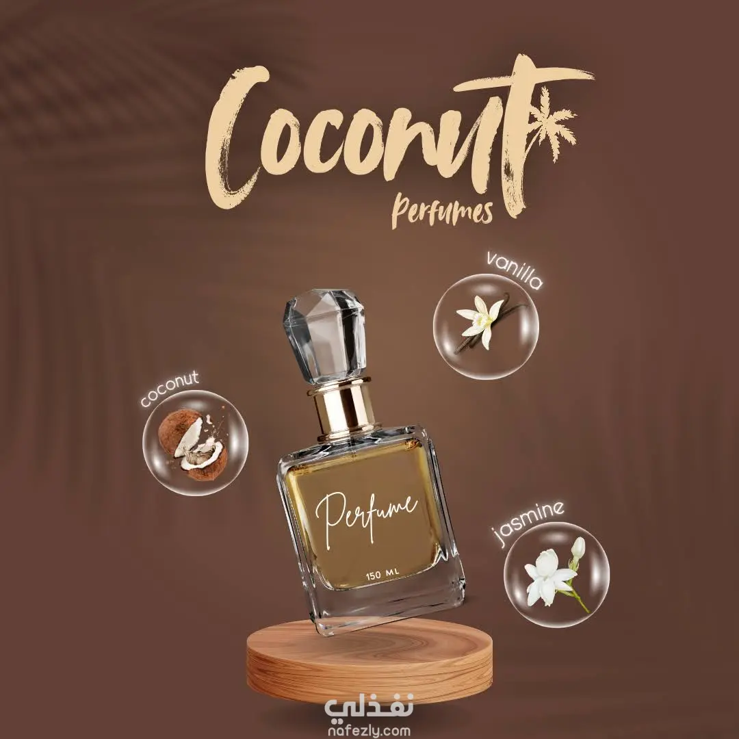 تم تركيب زجاجة العطر على منصة العرض الخشبية لإعطاء إحساس ثلاثي الأبعاد، استخدام خلفية متدرجة مع ظلال أوراق النخيل لإضفاء طابع استوائي فاخر، عرض المكونات العطرية الأساسية (جوز الهند، الفانيليا، الياسمين) بشكل دائري وموضح وأخيراً اختيار خطوط جريئة وأنيقة تناسب منتجات العطور.