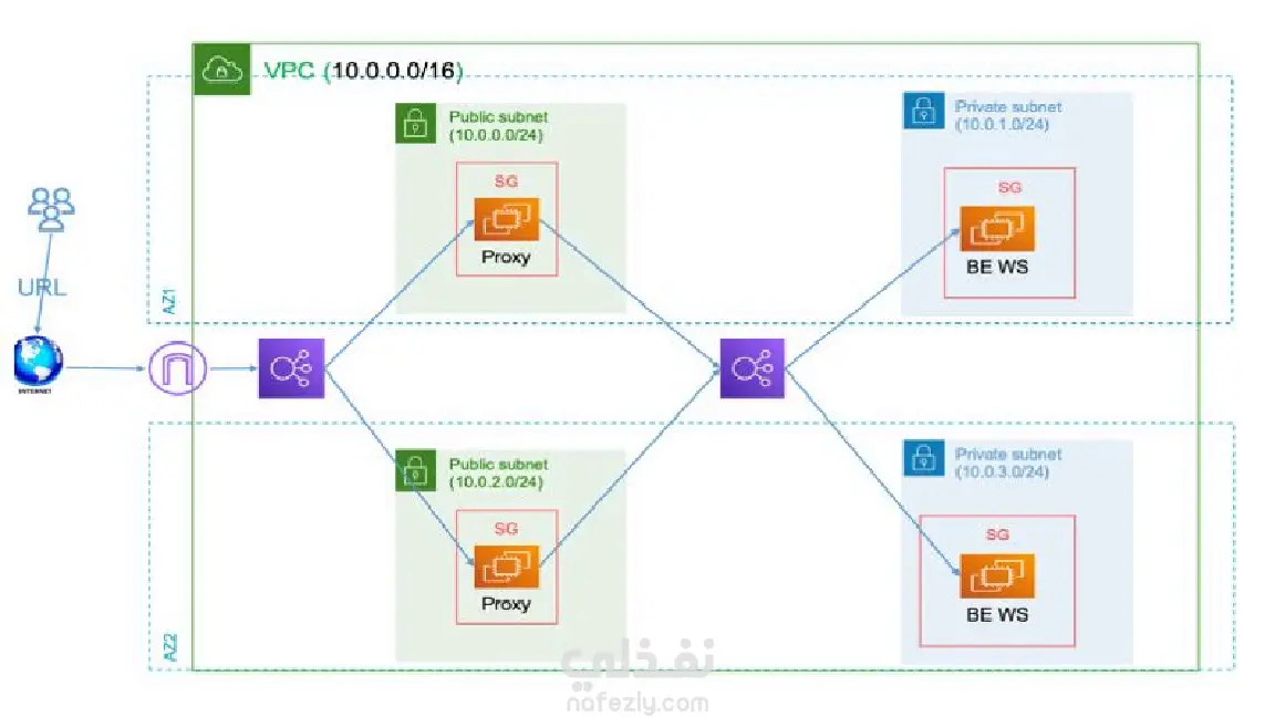 الطبقة العامة (Public Tier): موازن تحميل موجه للإنترنت (Application Load Balancer) وخوادم Nginx Proxy.