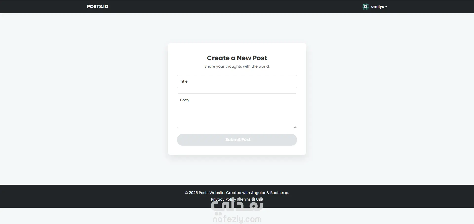 A responsive web application built with Angular and Bootstrap that allows users to view, create, and manage posts. The project demonstrates core Angular concepts such as components, services, data binding, routing, and dependency injection. It also uses Bootstrap for a clean, mobile-friendly interface. The app structure follows best practices for scalability and maintainability, making it a solid foundation for larger CRUD-based applications. Key Features: Display list of posts dynamically using Angular components Add and delete posts with two-way data binding Responsive layout with Bootstrap grid system Organized project structure following Angular CLI conventions