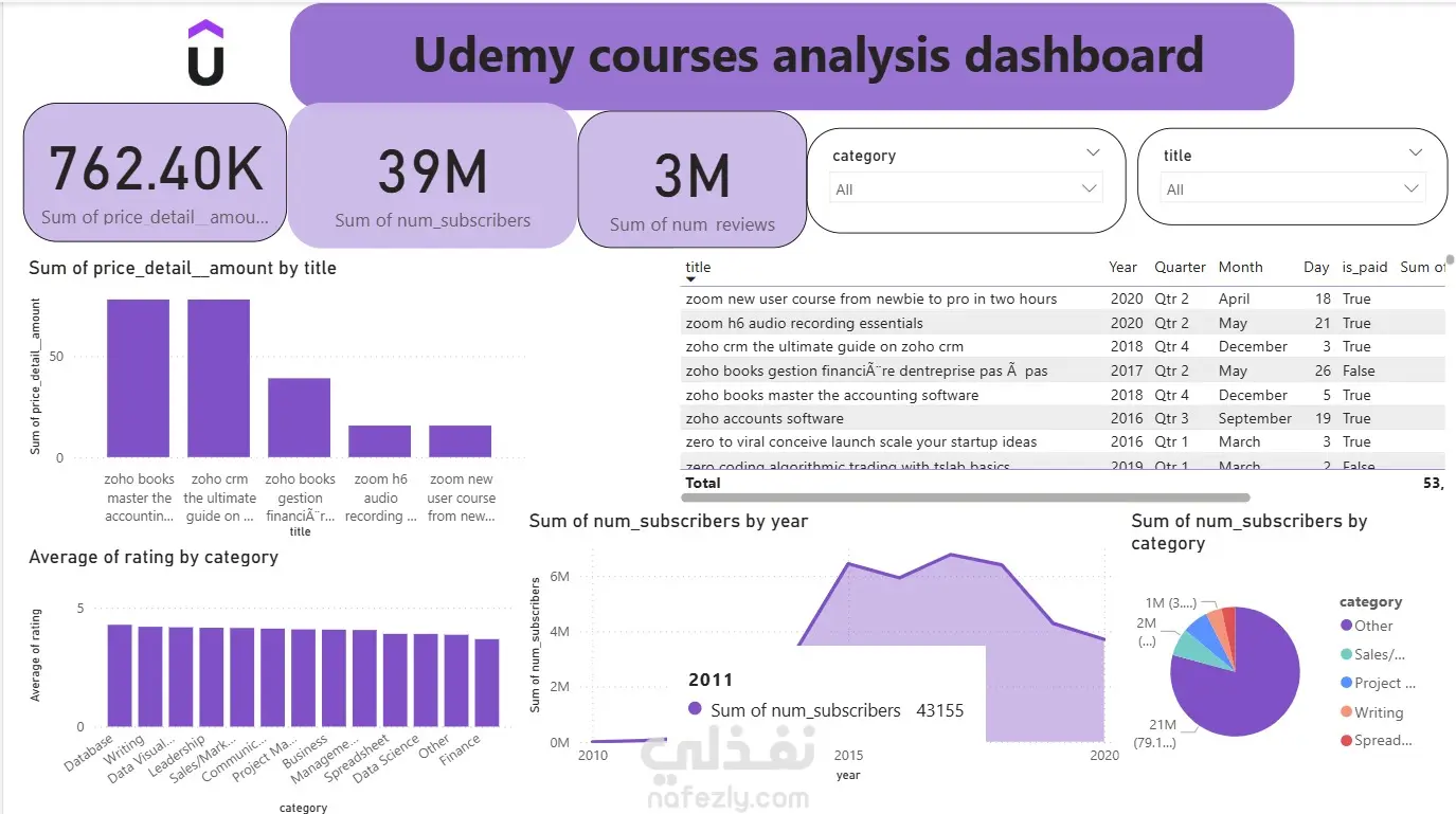 تم الاعتماد على تصميم بسيط وجذاب بالألوان الموحدة، مع استخدام فلاتر تفاعلية (category & title) لتسهيل استكشاف البيانات واتخاذ القرارات بناءً على التحليل البصري.