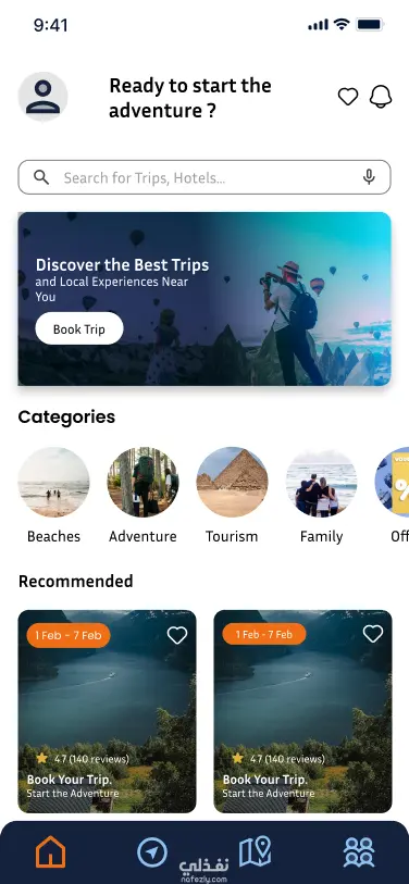 ركّزت على تقديم تجربة مستخدم مريحة من خلال توزيع العناصر بوضوح واستخدام ألوان مستوحاة من الطبيعة والسماء لتعكس روح السفر والمغامرة.