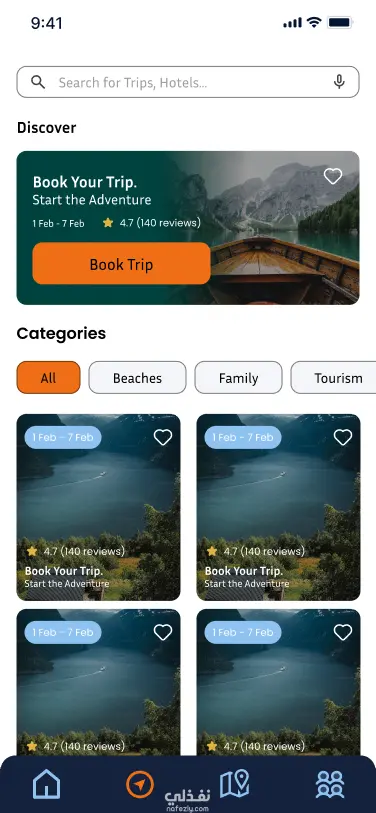 في هذا المشروع صمّمت واجهة تطبيق رحلات تهدف إلى تسهيل حجز الرحلات واستكشاف الوجهات السياحية بطريقة جذابة وسهلة الاستخدام.