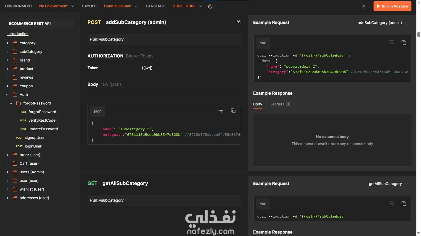 هذا هو API للواجهة الخلفية لمنصة تجارة إلكترونية تم بناؤه باستخدام JavaScript باستخدام Node.js وExpress. يوفر مسارات متعددة لإدارة الأقسام، المنتجات، المستخدمين، الطلبات، سلة التسوق، المراجعات، والمزيد.