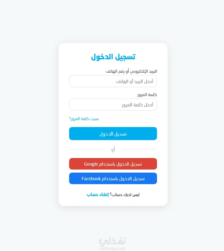 قمت بتصميم واجهة تسجيل دخول عصرية لتطبيق طبي باستخدام HTML وCSS، مع التركيز على تجربة المستخدم وسهولة التفاعل. التصميم يعتمد على اللون الأساسي #00AEEF والخط Neo Sans Arabic ليتناسب مع الطابع الصحي والاحترافي للتطبيق. تحتوي الواجهة على: حقول إدخال البريد الإلكتروني / الهاتف وكلمة المرور زر تسجيل الدخول الرئيسي روابط "نسيت كلمة المرور" و"إنشاء حساب" أزرار تسجيل الدخول عبر Google وFacebook الواجهة متجاوبة تمامًا مع جميع الأجهزة وتتميز بتصميم بسيط ومريح للعين.