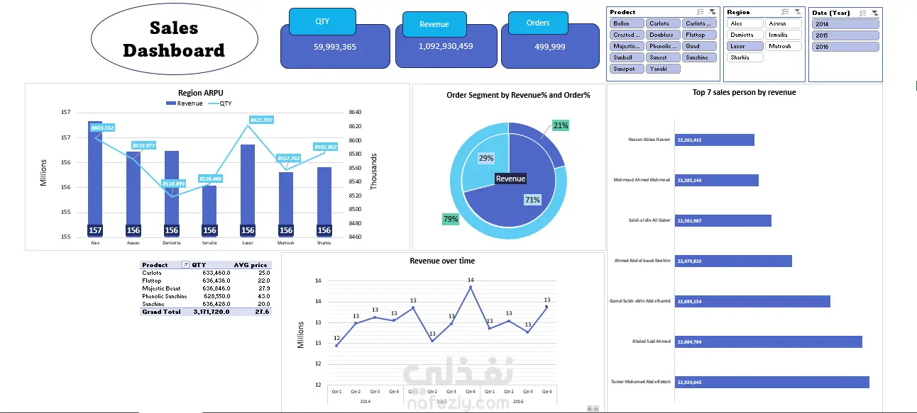 لوحة تحكم تفاعلية لتحليل المبيعات صُممت باستخدام Excel، وتهدف إلى توضيح الأداء العام للمبيعات من حيث الكمية، الإيرادات، وعدد الطلبات عبر الفترات الزمنية المختلفة والمناطق الجغرافية. -تحتوي اللوحة على مجموعة من المؤشرات الرئيسية (KPIs) مثل: إجمالي الكميات المباعة (QTY) إجمالي الإيرادات (Revenue) إجمالي عدد الطلبات (Orders) كما توضح: 1-مقارنة الإيرادات والكمية حسب المنطقة (Region ARPU) لتحديد أفضل وأقل المناطق أداءً. 2-نسبة الإيرادات إلى الطلبات (Order Segment) في شكل مخطط دائري لتوضيح توزيع المبيعات. 3-أداء المبيعات بمرور الوقت (Revenue over time) لمتابعة تطور الإيرادات عبر السنوات والفصول (Quarters). 4-أفضل 7 مندوبين مبيعات حسب الإيرادات (Top 7 Salespersons by Revenue) لقياس الأداء الفردي. 5-جدول المنتجات الذي يعرض الكمية ومتوسط السعر لكل منتج. كما تحتوي اللوحة على فلاتر تفاعلية (Slicers) تُمكّن المستخدم من تصفية البيانات حسب المنتج، المنطقة، والسنة، مما يجعل عملية التحليل أكثر دقة وسلاسة.