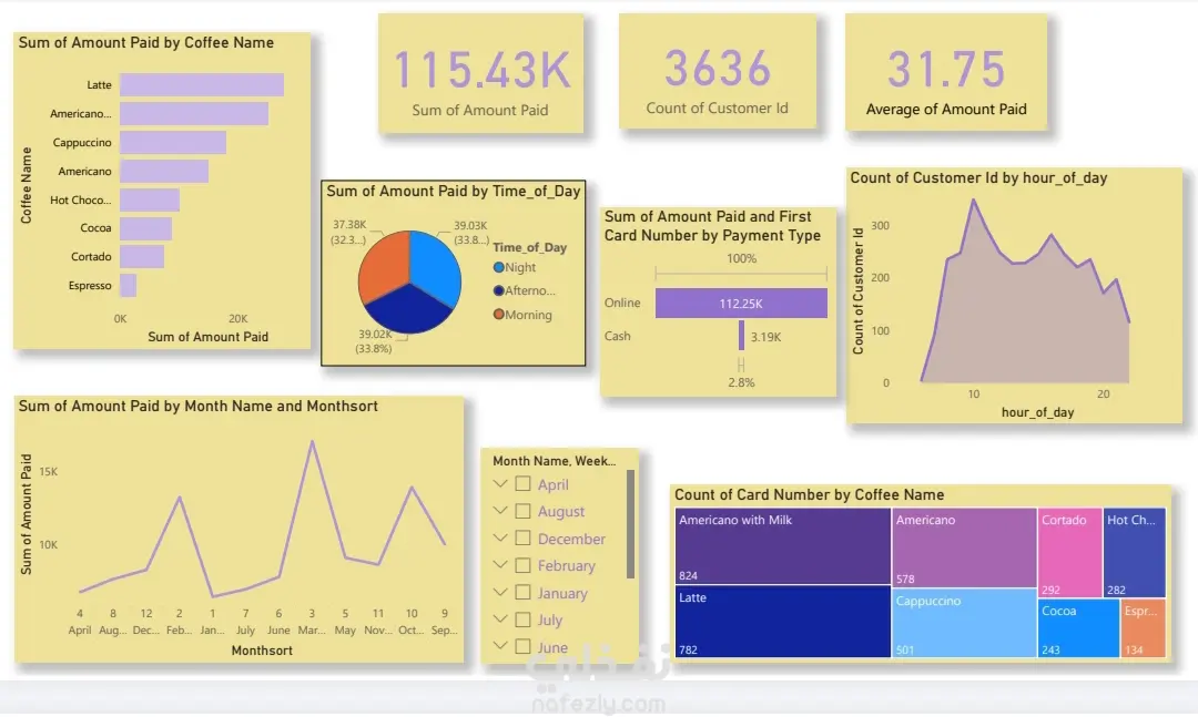 تحليل بيانات المبيعات وتصميم لوحة معلومات تفاعلية توضح أهم مؤشرات الأداء مثل إجمالي المبيعات، عدد العملاء، ومتوسط الإنفاق لكل عميل. تشمل اللوحة تحليل أنواع القهوة الأكثر مبيعًا، طرق الدفع المستخدمة، أوقات النشاط الأعلى خلال اليوم، واتجاهات المبيعات الشهرية.