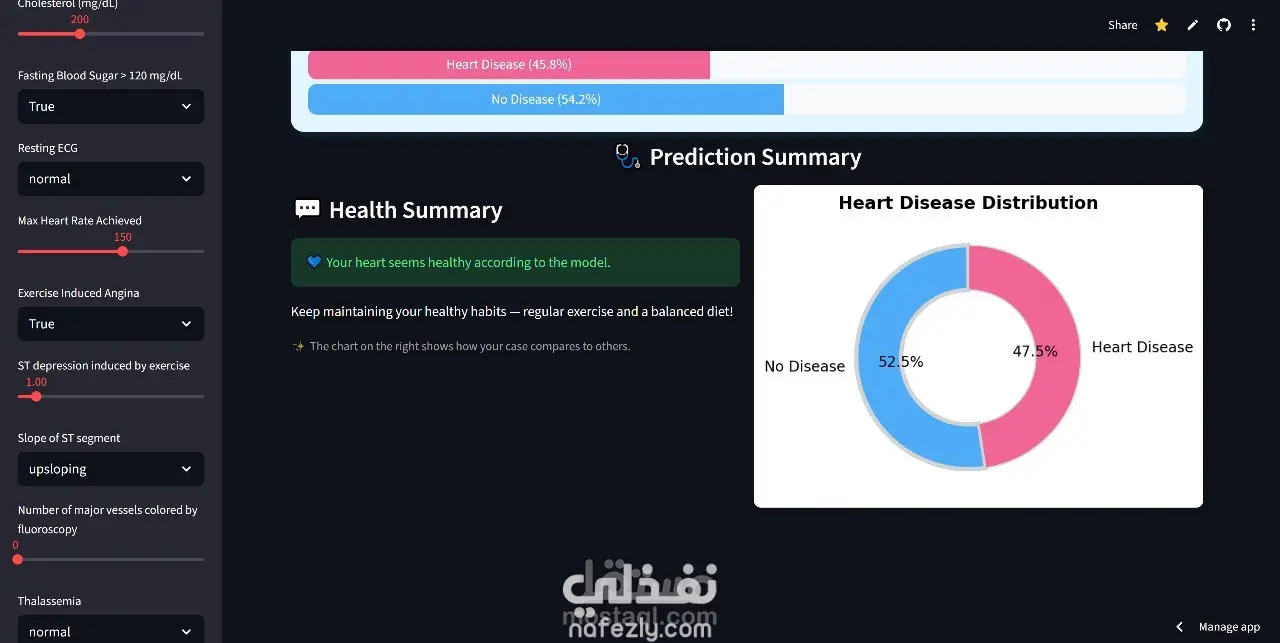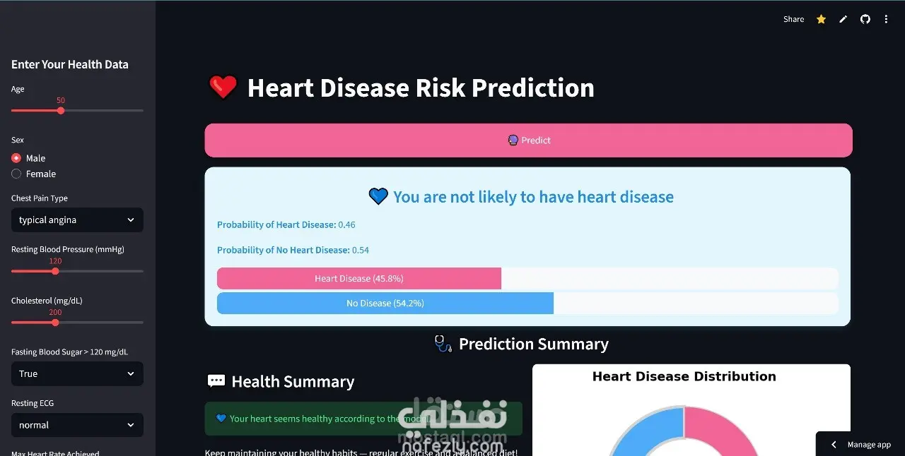 مشروع تحليل بيانات طبي يعتمد على الذكاء الاصطناعي لتوقع احتمالية الإصابة بأمراض القلب. تم تنفيذ المشروع باستخدام خوارزميات التعلم الآلي (Machine Learning) على بيانات UCI، حيث تم إجراء مراحل متكاملة تشمل: تنظيف البيانات ومعالجتها اختيار الميزات المهمة (Feature Selection) تطبيق خوارزميات التصنيف مثل Random Forest وLogistic Regression تقييم الأداء باستخدام معايير الدقة وROC Curve تطوير واجهة تفاعلية باستخدام Streamlit لتمكين المستخدم من إدخال القيم والحصول على التوقع مباشرة المشروع متكامل من التحليل حتى النشر عبر الويب.