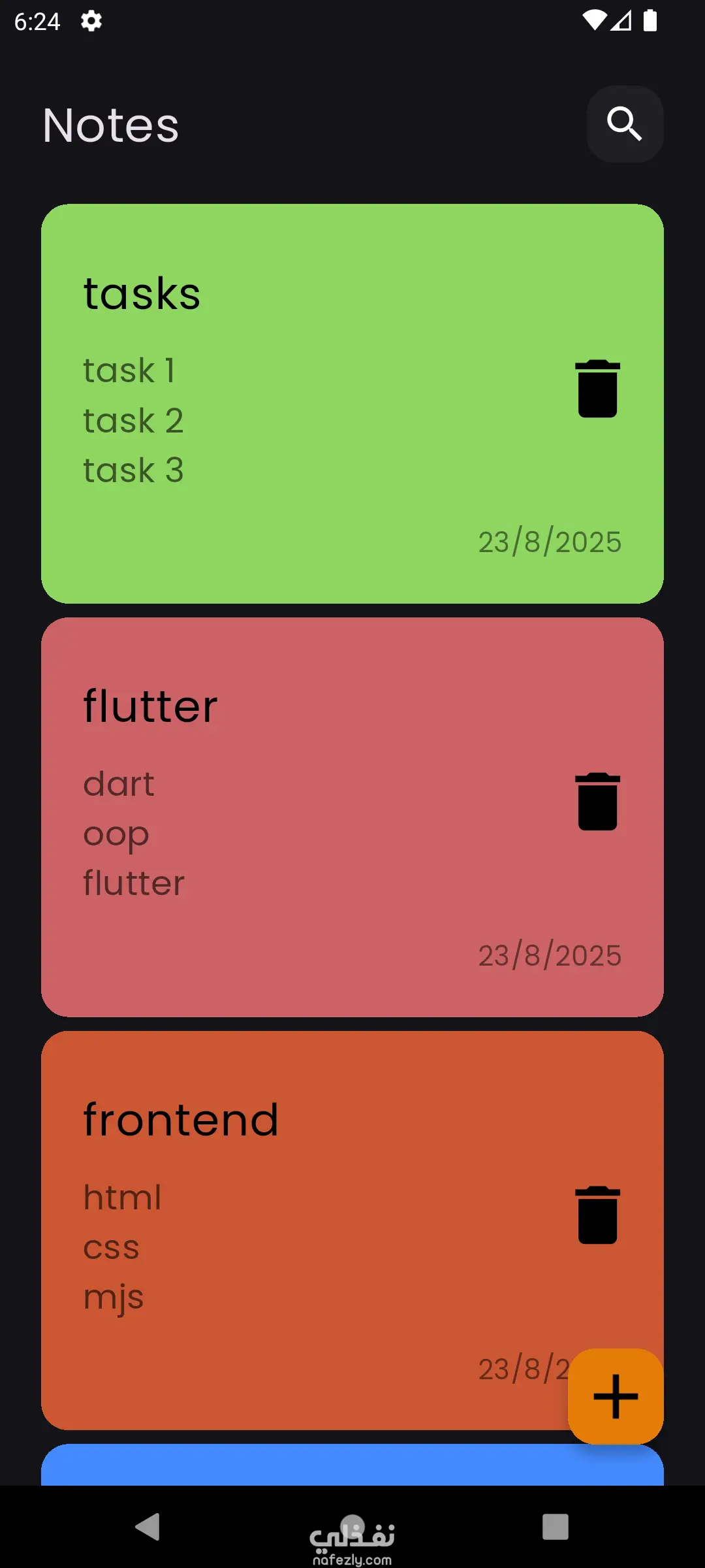 تطبيق الملاحظات (Notes App) تطبيق ملاحظات بسيط وأنيق مبني باستخدام Flutter يتيح للمستخدمين إنشاء الملاحظات، البحث فيها، وتنظيمها بسهولة. تم الاعتماد على flutter_bloc لإدارة الحالة بشكل احترافي، مما يجعل التطبيق سريع ومرن في الاستخدام. المميزات: إضافة الملاحظات: إنشاء ملاحظة جديدة بعنوان، محتوى، ولون مميز. عرض الملاحظات: مشاهدة جميع الملاحظات بواجهة منظمة وأنيقة. تعديل الملاحظات: تحديث العنوان أو المحتوى أو اللون لملاحظاتك السابقة. حذف الملاحظات: إزالة أي ملاحظة غير مرغوب فيها بسهولة. البحث في الملاحظات: البحث الديناميكي أثناء الكتابة. البحث بالعنوان فقط. مرونة في البحث (مطابقة أول الكلمة أو أي جزء منها). ألوان متنوعة: إمكانية تعيين ألوان مختلفة لكل ملاحظة لتسهيل التنظيم.