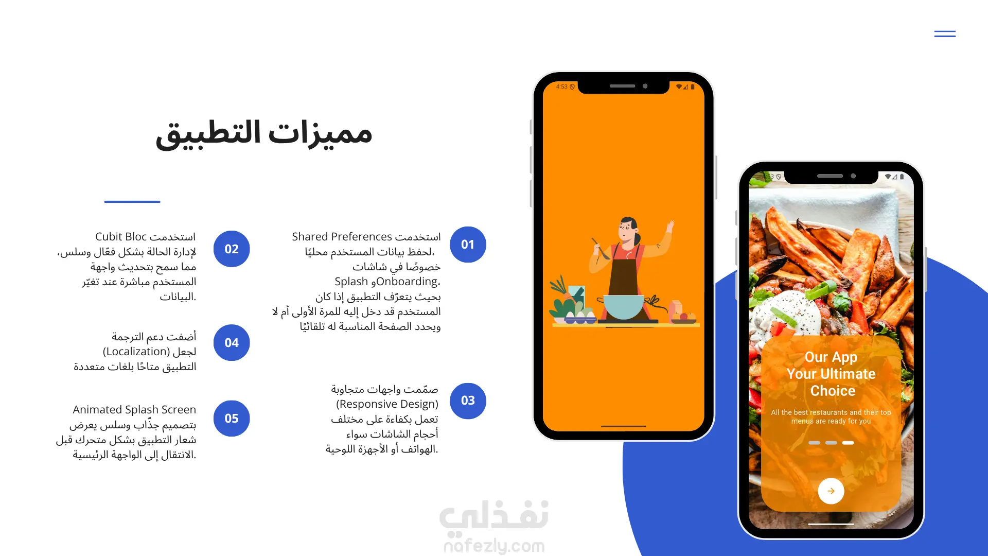تطبيق يعرض مجموعة من الوجبات مع تفاصيلها (المكونات، خطوات التحضير، الصورة)، تم بناؤه باستخدام Flutter مع Cubit لإدارة الحالة، وتصميم متجاوب يدعم تعدد اللغات. الخصائص الأساسية: عرض قائمة الوجبات بشكل منظم مع صفحة تفصيلية لكل وجبة. إمكانية تصفية الوجبات حسب النوع أو النظام الغذائي (نباتي، خالي من الجلوتين، إلخ). إضافة الوجبات إلى المفضلة مع حفظ الحالة محليًا باستخدام SharedPreferences. دعم الترجمة (Localization) لتبديل لغة التطبيق بسهولة. تصميم Responsive متكيف مع جميع أحجام الشاشات. إدارة الحالة باستخدام Cubit لسهولة التحكم في التغييرات داخل التطبيق وتنظيم الكود. التقنيات والأدوات المستخدمة: Flutter & Dart Cubit (Bloc Library) لإدارة الحالة SharedPreferences لتخزين البيانات محليًا Localization لدعم أكثر من لغة Responsive UI لتجربة مستخدم متكاملة على مختلف الأجهزة