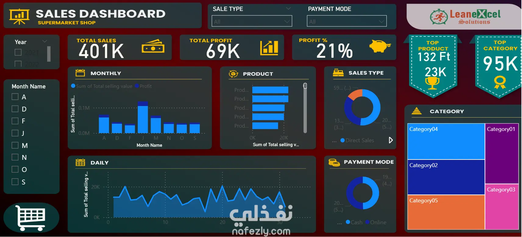 لوحة تحكم تفاعلية توضح أداء المبيعات في متجر سوبرماركت بطريقة احترافية وسهلة الفهم. تتضمن مؤشرات رئيسية مثل إجمالي المبيعات، الأرباح، ونسبة الربح، مع إمكانية عرض البيانات شهريًا ويوميًا. كما تعرض أفضل المنتجات والفئات مبيعًا، وأنواع المبيعات (مباشرة أو عبر الإنترنت)، إضافة إلى طرق الدفع المختلفة. تم تصميم اللوحة باستخدام أدوات تحليل البيانات لتوفير رؤية شاملة تساعد في اتخاذ القرارات وتحسين أداء المتجر