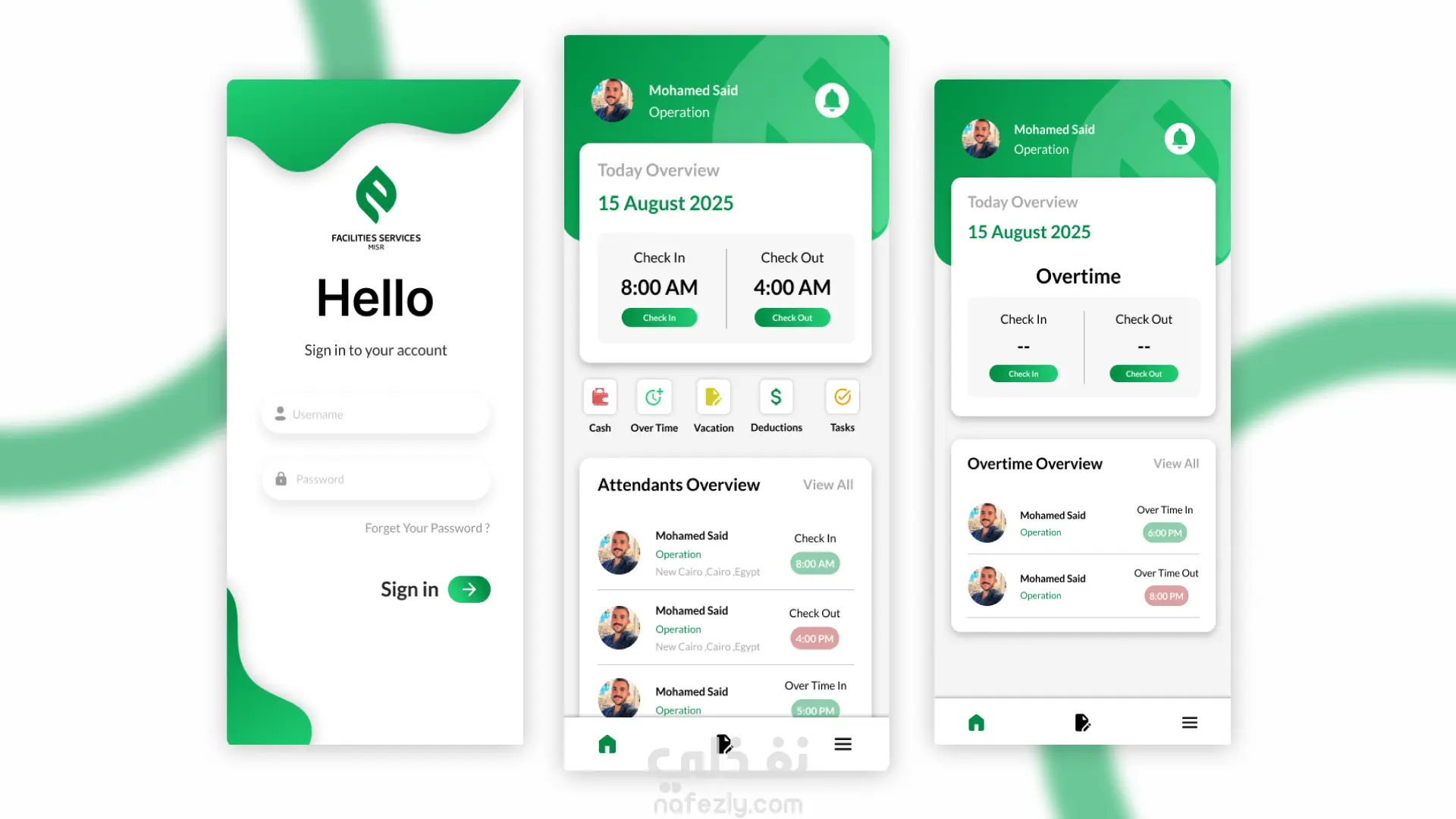 يشمل النظام تطبيقًا للموظفين لتسجيل الحضور والانصراف باستخدام الموقع الجغرافي (GPS)، بالإضافة إلى لوحة تحكم ويب للمديرين لمتابعة الحضور في الوقت الفعلي، وعرض التقارير اليومية والشهرية، وتصدير البيانات بصيغة Excel أو PDF.