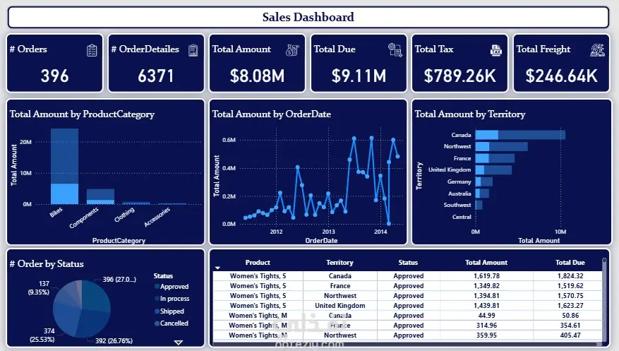 تم إنشاء لوحة تحكم متكاملة لتحليل بيانات المبيعات باستخدام أدوات تحليل البيانات. اللوحة تعرض مؤشرات الأداء الرئيسية (KPIs) بشكل مرئي وسهل الفهم، وتشمل: إجمالي عدد الطلبات والتفاصيل المرتبطة بها. إجمالي المبالغ المستحقة والمدفوعة والضرائب وتكاليف الشحن. توزيع المبيعات حسب الفئة (Product Category). تحليل المبيعات حسب التاريخ (Order Date) لمعرفة الاتجاهات بمرور الوقت. مقارنة الأداء بين المناطق الجغرافية (Territories). تحليل الطلبات حسب الحالة (Status) (معتمد، قيد التنفيذ، تم الشحن، ملغي). تم تصميم الداشبورد بألوان احترافية (درجات الأزرق) مع تنسيق متناسق لتسهيل قراءة البيانات واتخاذ القرارات المبنية على الرؤى التحليلية.