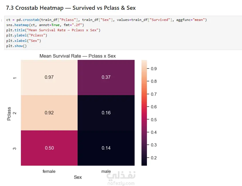 تحليل الخصائص الديموغرافية والعوامل المؤثرة في النجاة، ودراسة العلاقة بين العمر، النوع، الدرجة، والسعر وتأثيرها على فرص البقاء، مع إبراز مهاراتي في معالجة البيانات والهندسة المميزة والتحليل البصري وتقديم رؤى تطبيقية مدعومة بتمثيلات دقيقة وواضحة.