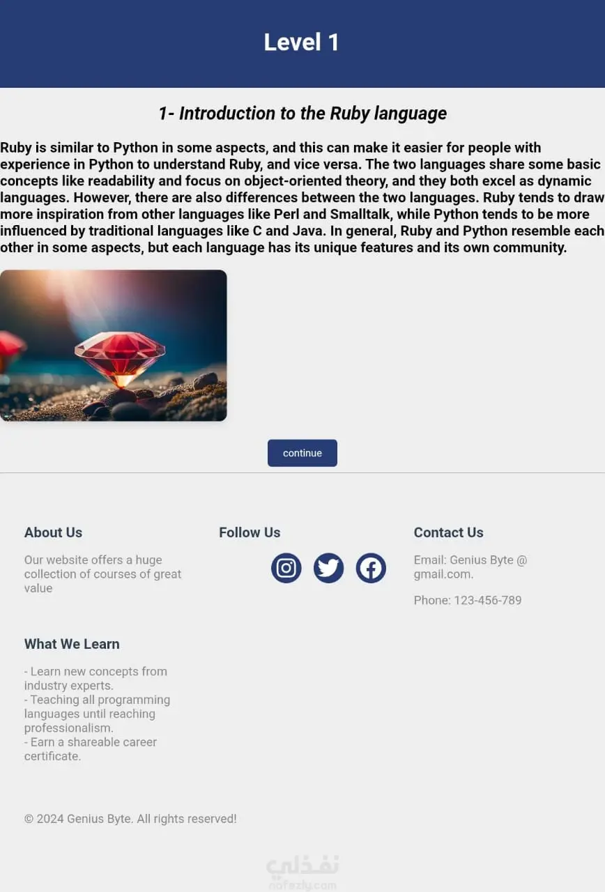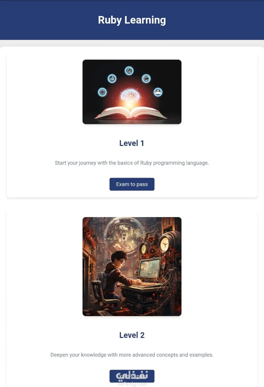 صممت منصة تعليمية تفاعلية باستخدام HTML وCSS وJavaScript لتعليم أساسيات لغة Ruby على مستويين. كل مستوى يحتوي على شروحات مبسطة وأسئلة تدريبية، وفي النهاية اختبار يحدد نجاح المتعلم، مع عرض رسالة تهنئة عند اجتياز المستوى بنجاح.