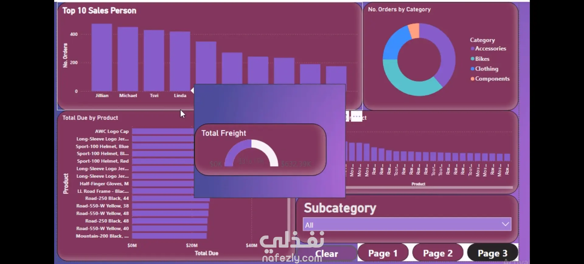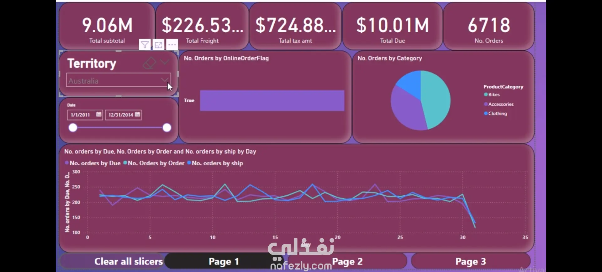 صممت لوحات عرض تفاعلية تشمل الرسوم البيانية العمودية والدائرية والمقاطع (slicers) لتقديم تمثيل بصري غني ومعبّر للبيانات.