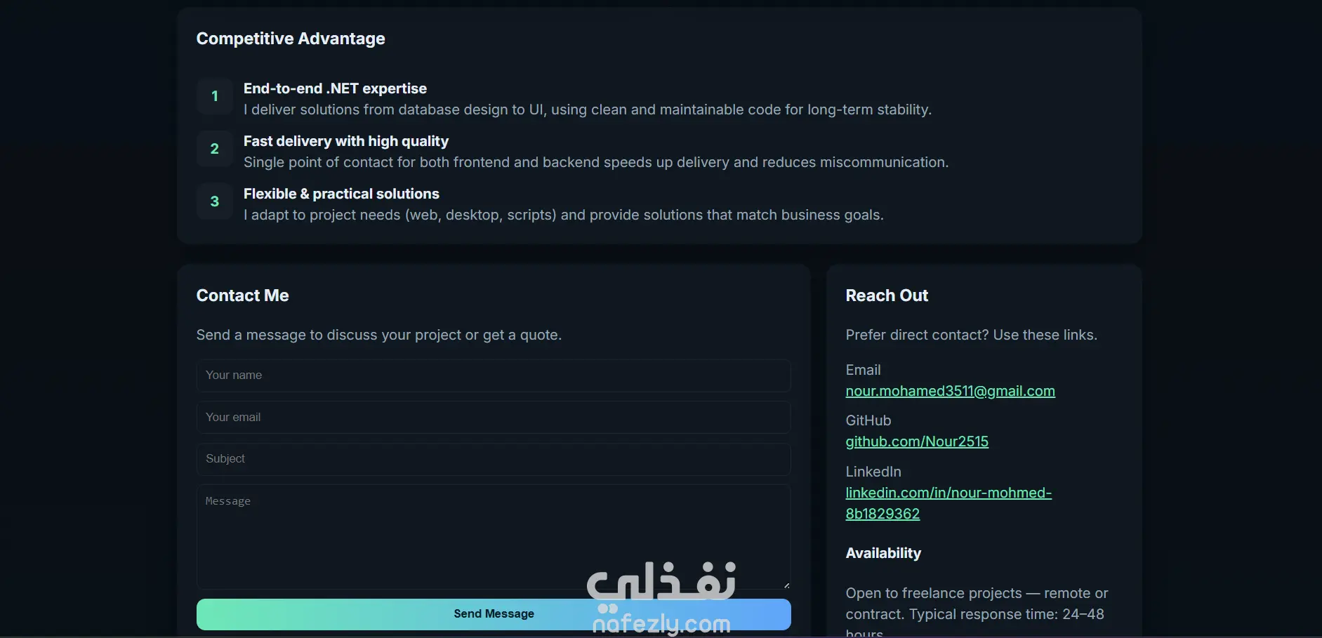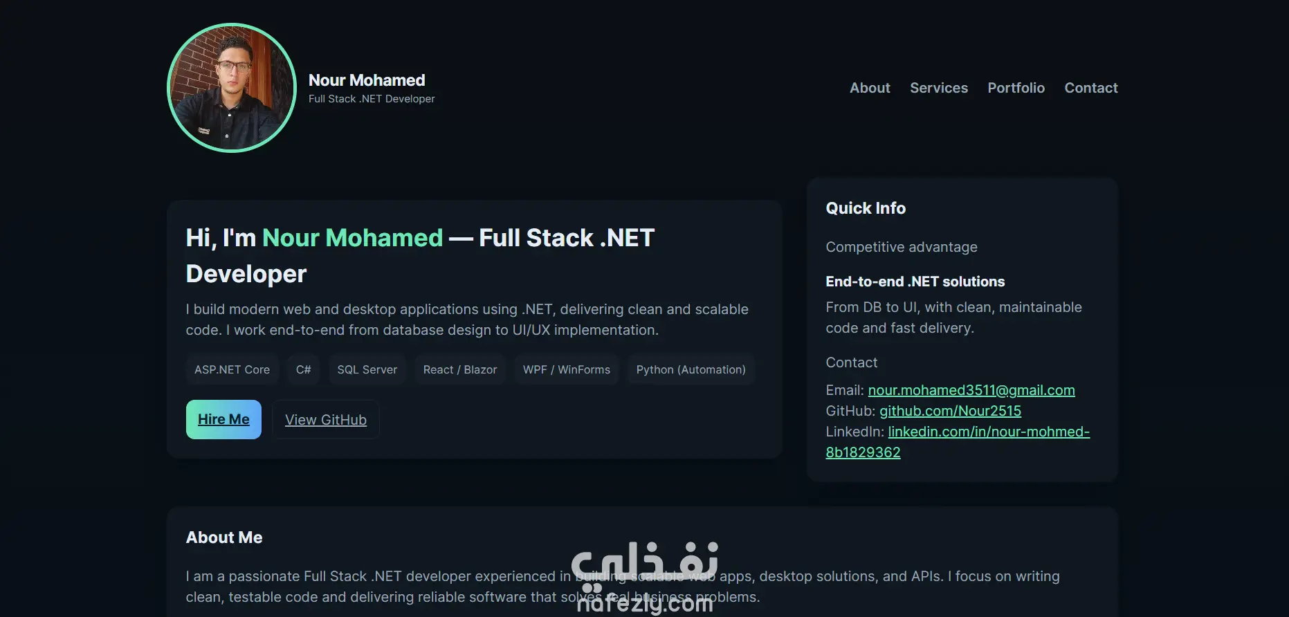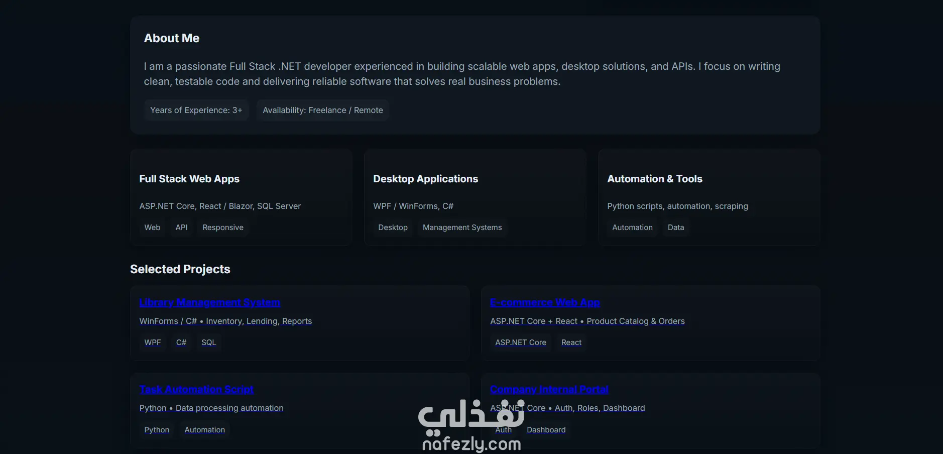 يتكوّن من صفحات أساسية مثل الصفحة الرئيسية، نبذة عني، المهارات، الأعمال، ووسائل التواصل.