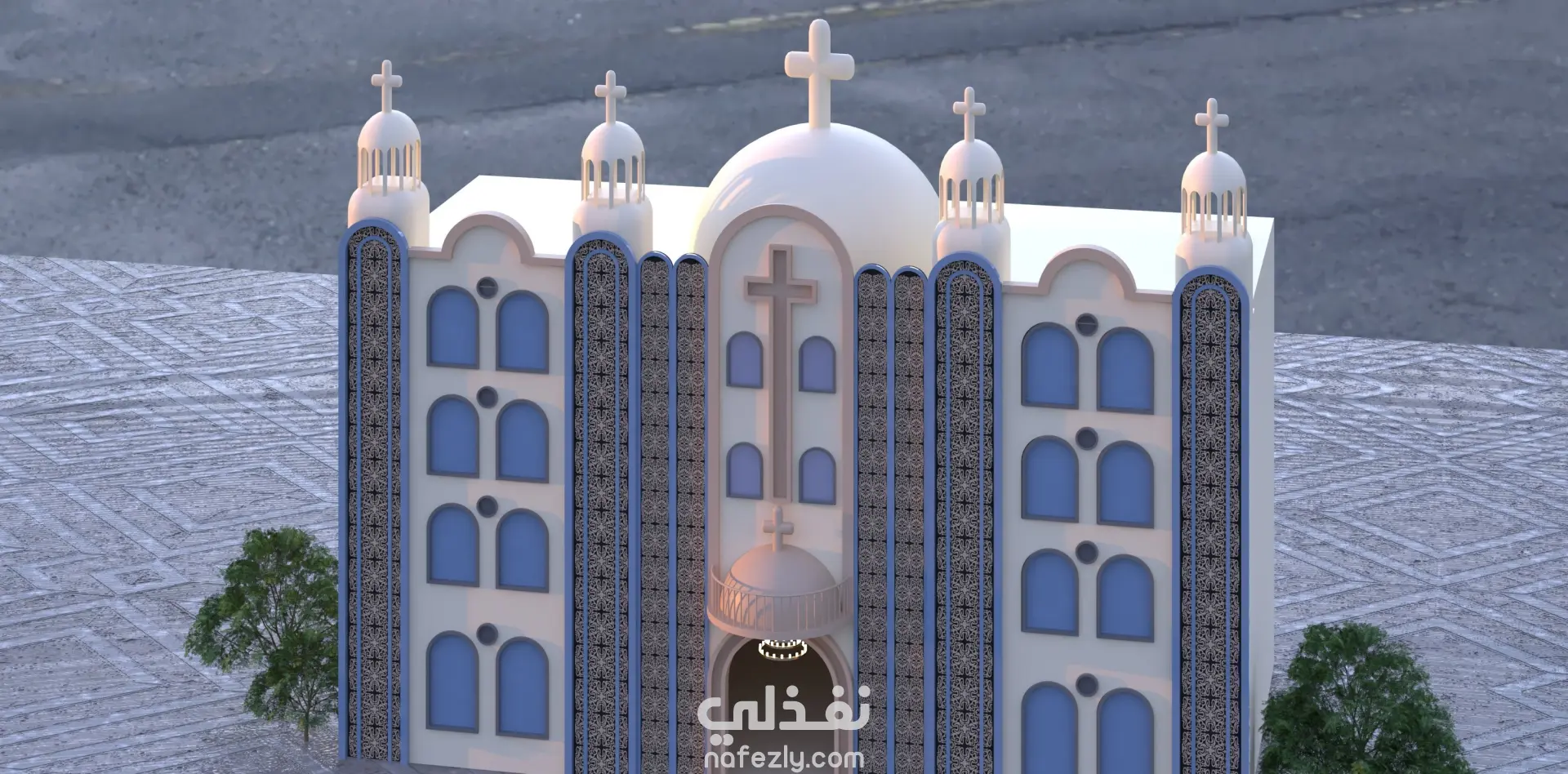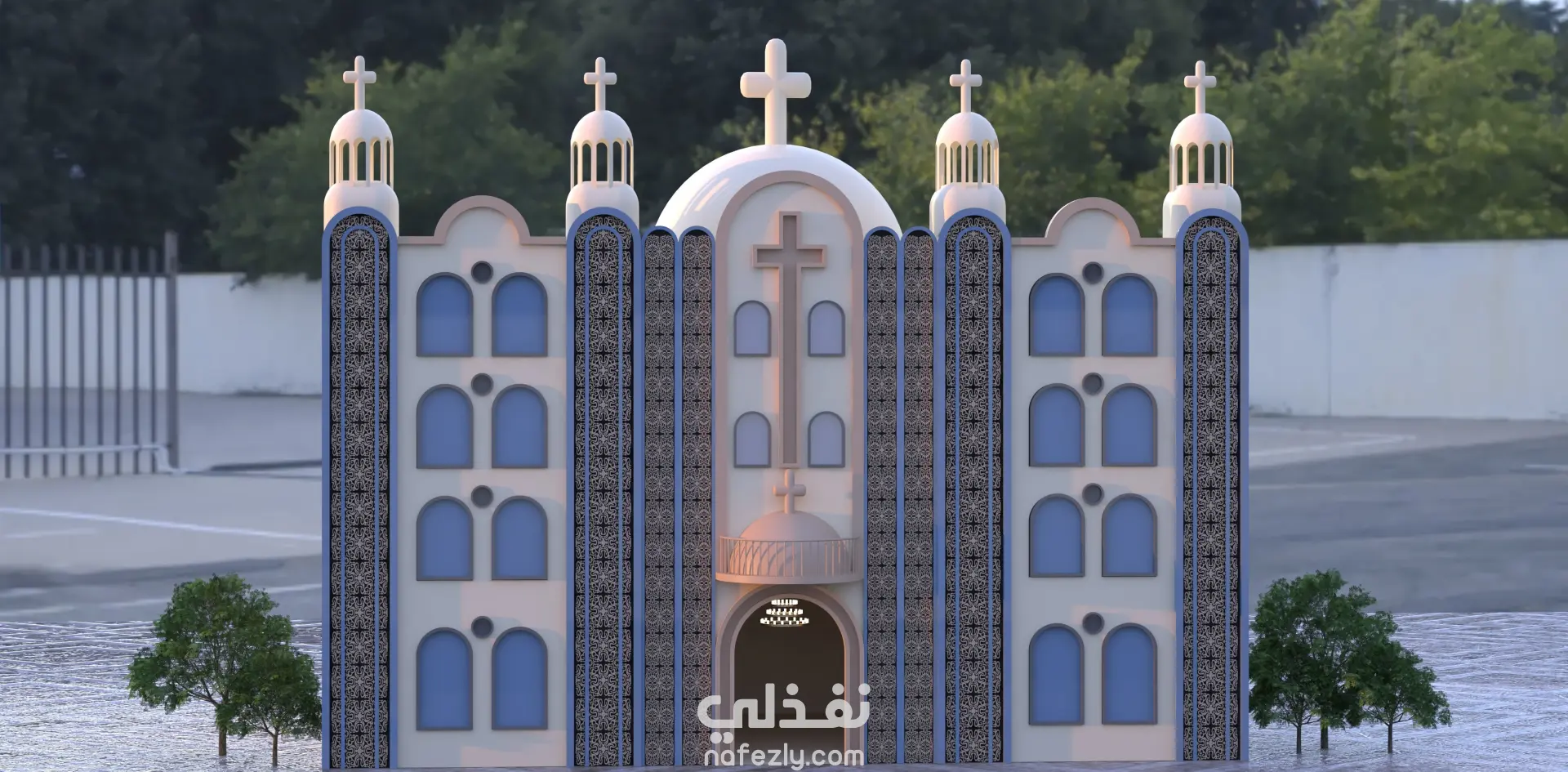 هذه الصورة عبارة عن تصميم مجسّم (3D) لكنيسة قبطية أرثوذكسية، تتميز بواجهة متناظرة وقبة مركزية بارزة . وهياكل أخرى مزينة بالصلبان، مما يعكس الطراز المعماري للكنائس القبطية.