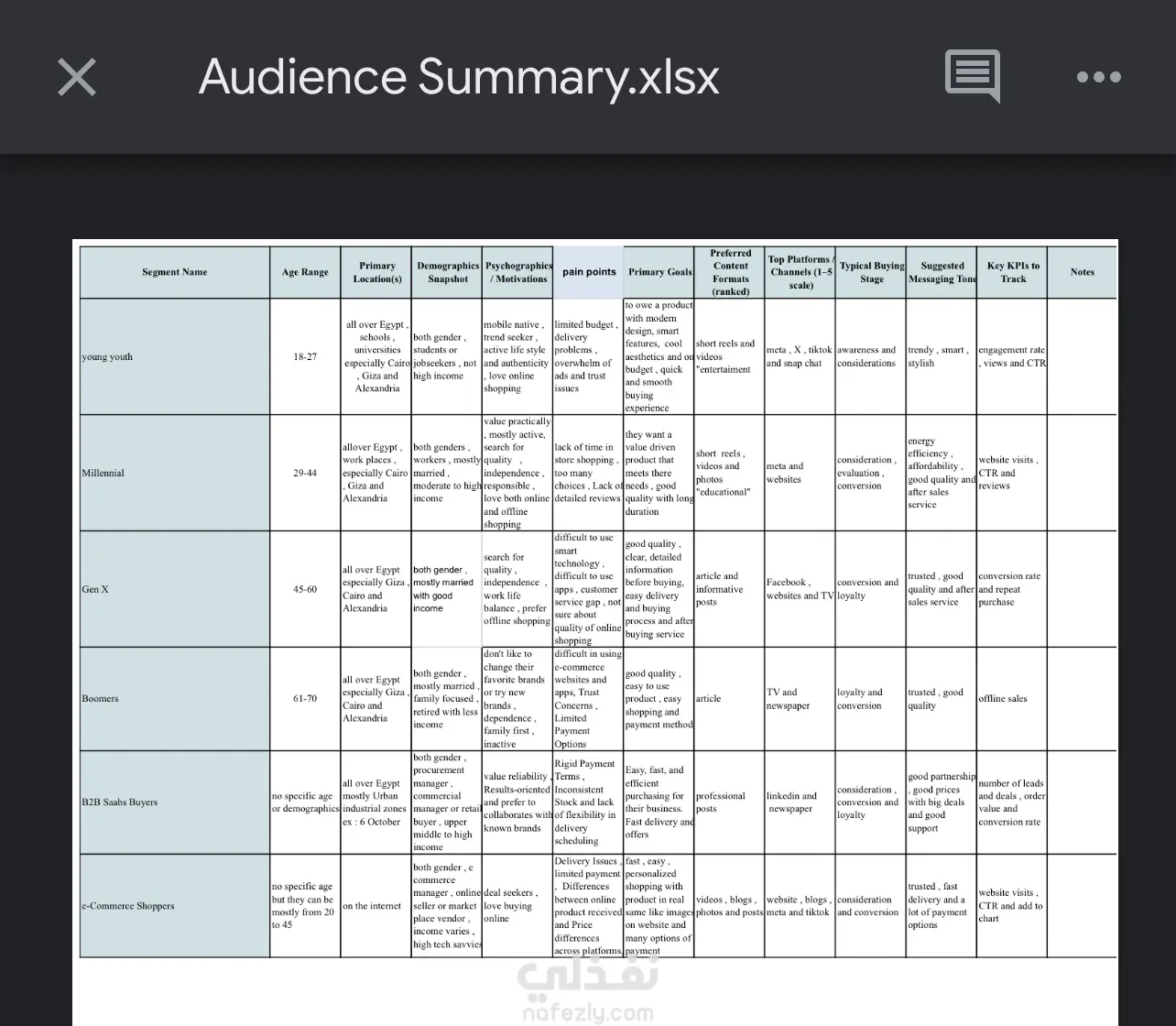 ملف excel يوجد به جميع النقاط اللازمه لتحليل الجمهور المستهدف للبراندات