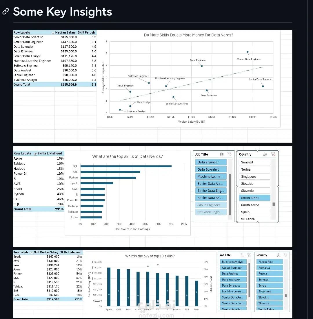 أجرينا تحليلًا شاملاً لسوق عمل محللي البيانات باستخدام ميزات Excel المتقدمة (Power Query وPower Pivot) لتنظيف البيانات وتحويلها ونمذجتها. استكشف المشروع الطلب على المهارات التقنية الرئيسية (SQL وPython وTableau وPower BI وOracle) وارتباطها بالرواتب في مختلف المناطق. كما أنشأنا نموذج بيانات علائقية باستخدام مقاييس DAX وتقارير Pivot للإجابة على أسئلة موجهة نحو الأعمال، مثل: ما هي المهارات الأكثر شيوعًا في إعلانات الوظائف، والتي توفر أفضل ميزة للرواتب، وكيف تختلف الرواتب بين الأسواق الأمريكية وغير الأمريكية. كشف التحليل أن SQL هي المهارة الأكثر طلبًا (تظهر في أكثر من 50% من الإعلانات)، وأن Python هي المحرك الرئيسي للرواتب (بمتوسط 97 ألف دولار تقريبًا)، وأن أدوات التصور مثل Tableau وPower BI لا تزال ضرورية لفرص العمل، بينما لا تزال Oracle - وإن كانت أقل شيوعًا - مرتبطة بالوظائف ذات الأجور المرتفعة.