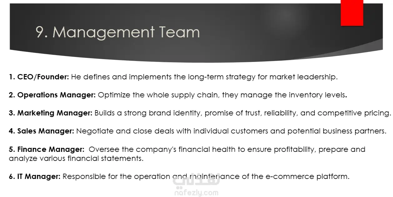 - فريق إداري متكامل يشمل: الرئيس التنفيذي، مدير العمليات، مدير التسويق، مدير المبيعات، المدير المالي، ومدير تكنولوجيا المعلومات.