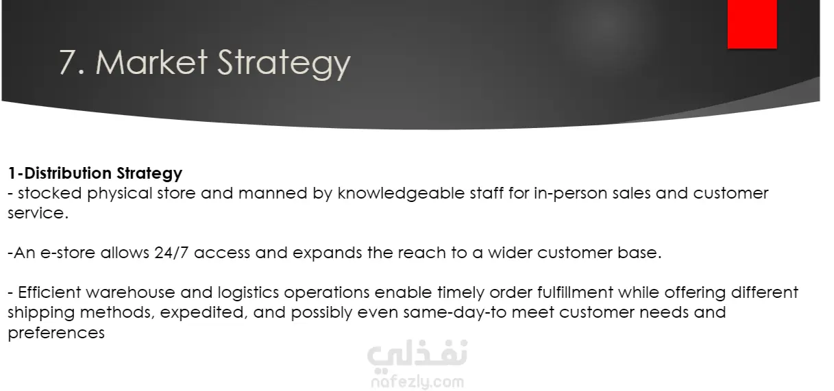 - التوزيع: متجر فعلي ومنصة إلكترونية متكاملة.