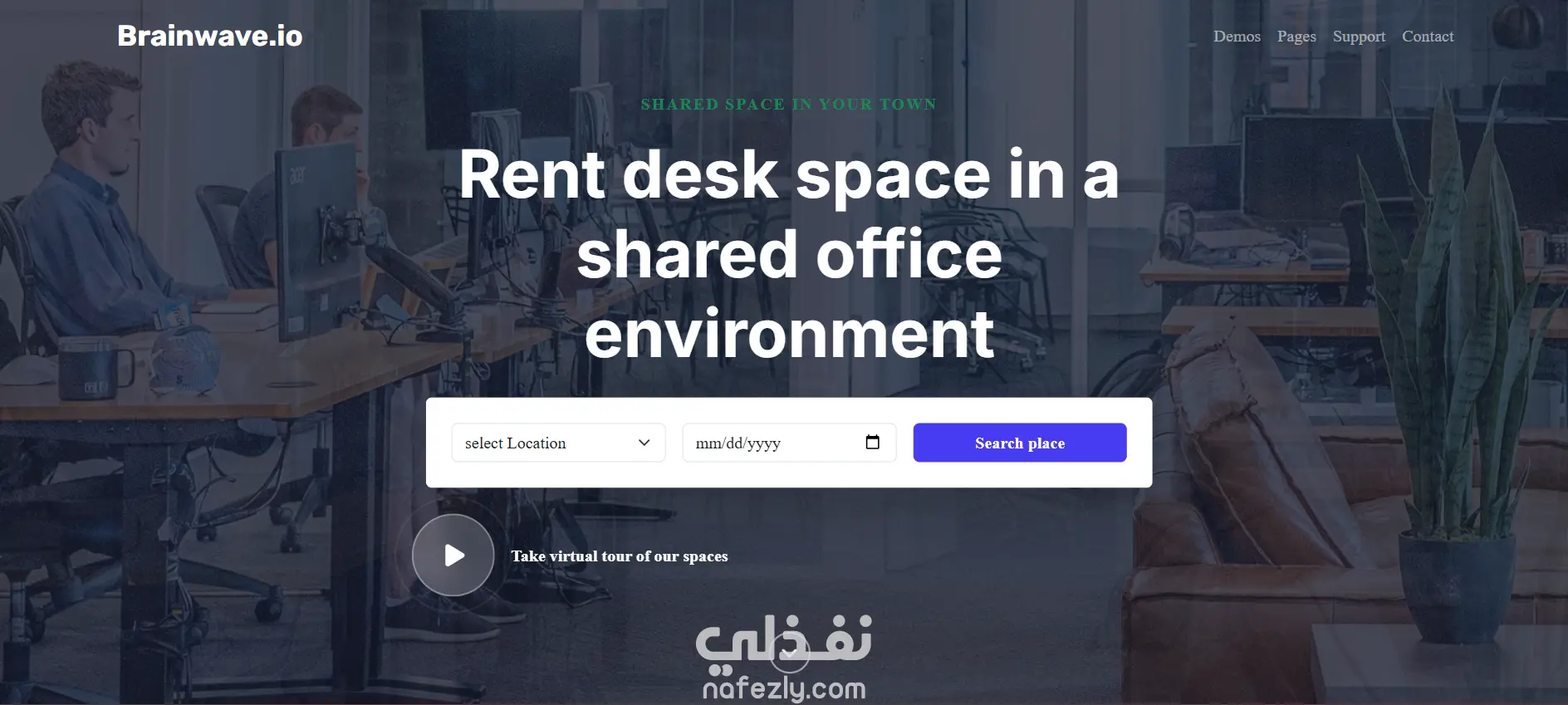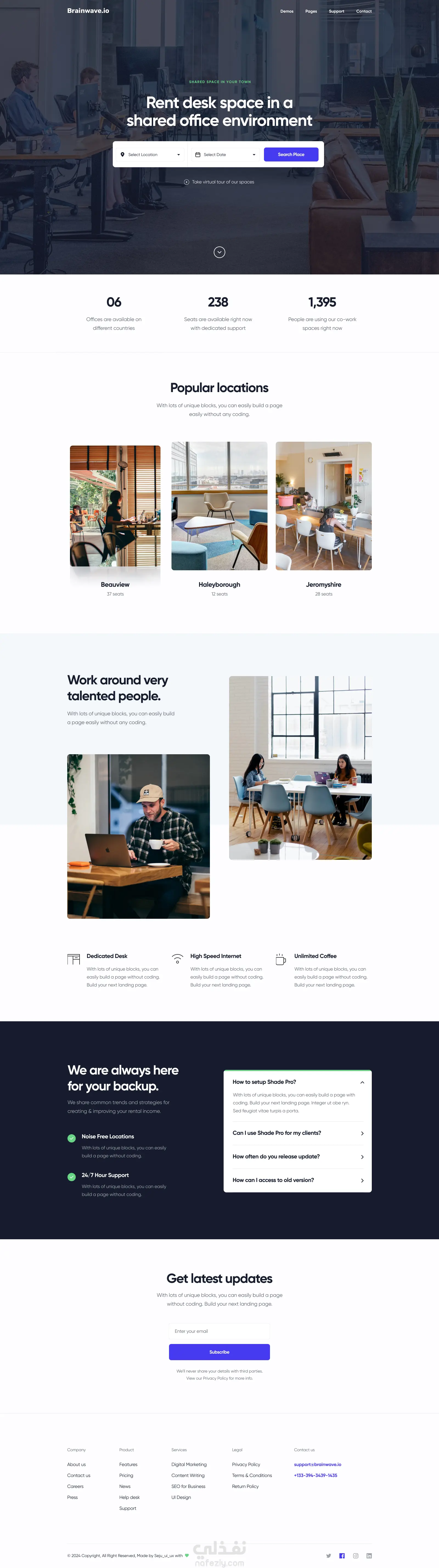 A responsive coworking landing page built with HTML, CSS, Bootstrap, and JavaScript. Features include a hero search bar, stats section, popular locations, feature highlights, FAQ accordion, newsletter form, and footer. Converted from a Brainwave.io Figma design.