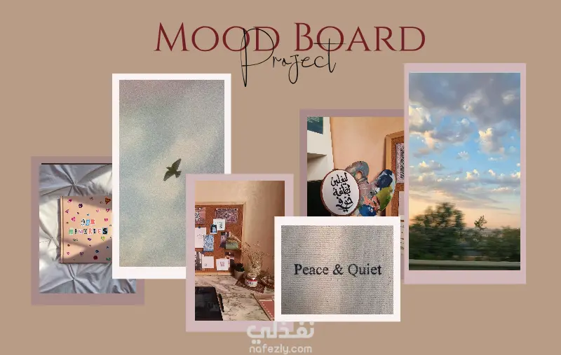 *لوحة المزاج (Mood Board): تجميع صور تعبر عن الطابع الهادئ والإبداعي، بما في ذلك لوحات فنية، رسوم يدوية، مناظر طبيعية، وكلمات مثل "Peace & Quiet" لتعكس جوهر العلامة في الذكريات والتجمعات.