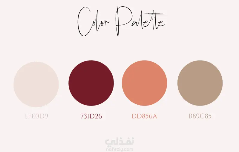 *لوحة الألوان: أربعة ألوان رئيسية (EFE0D9 - بيج فاتح، 731D26 - أحمر داكن، DD856A - برتقالي فاتح، B89C85 - بني خفيف) لضمان التوحيد في جميع التصاميم.