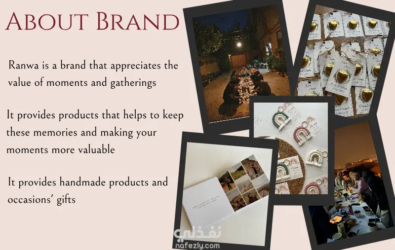 قمت بتصميم هوية بصرية كاملة لعلامة تجارية جديدة تدعى "Ranwa" (رنوى)، والتي تركز على المنتجات اليدوية والهدايا الخاصة بالمناسبات والتجمعات. العلامة تقدر قيمة اللحظات والذكريات، وتوفر منتجات تساعد في الحفاظ عليها وجعلها أكثر قيمة. الهدف كان إنشاء تصميم يعكس الدفء، الحميمية، والإبداع اليدوي، مع التركيز على الألوان الدافئة مثل الأحمر الداكن، البرتقالي الفاتح، البيج، والبني، بالإضافة إلى عناصر رسومية مستوحاة من الطبيعة والتجمعات.