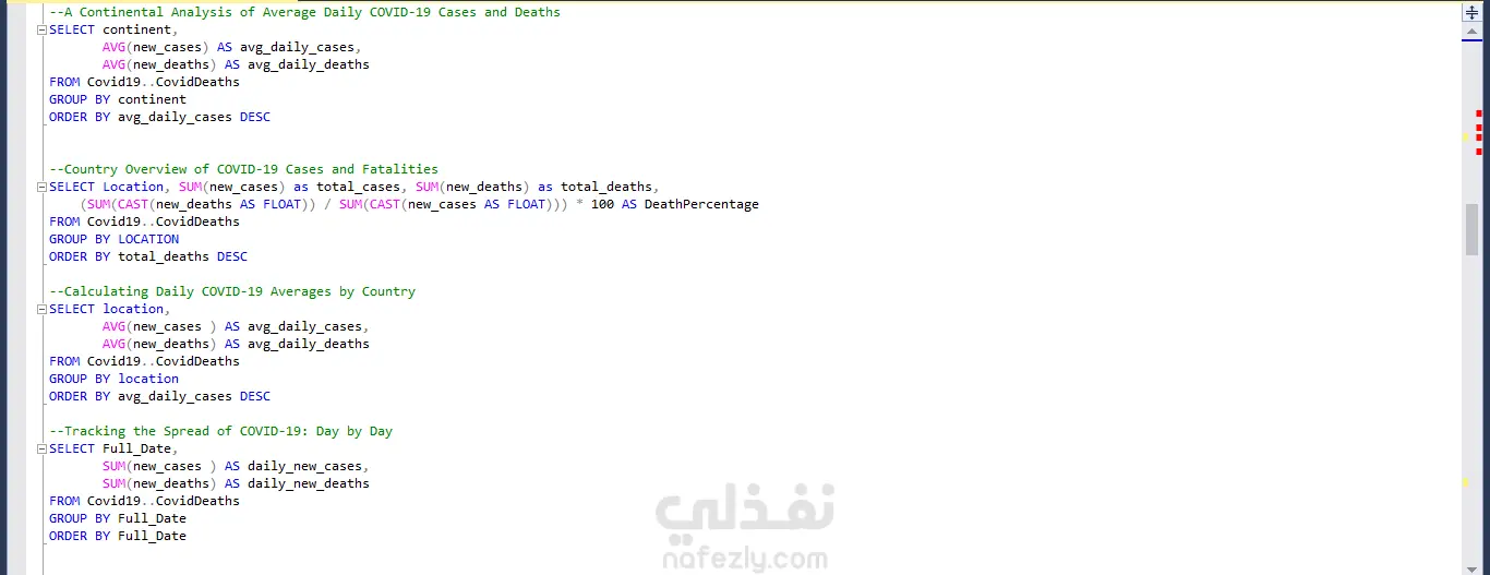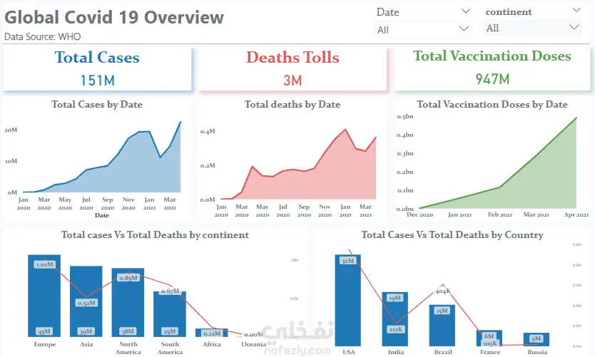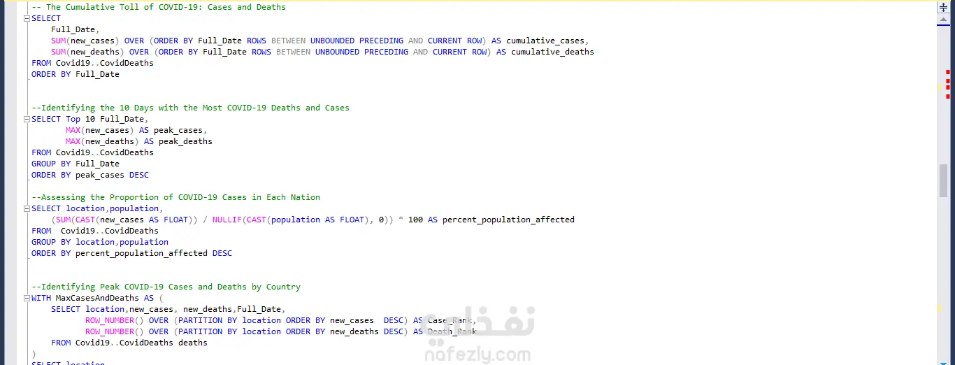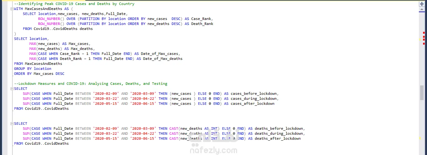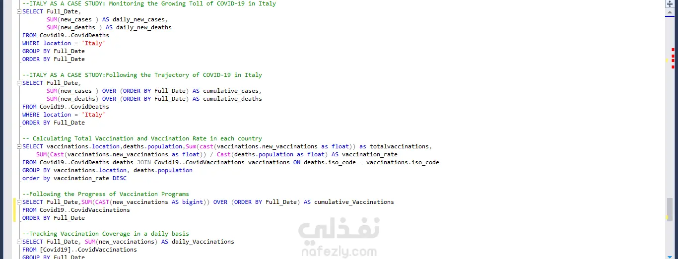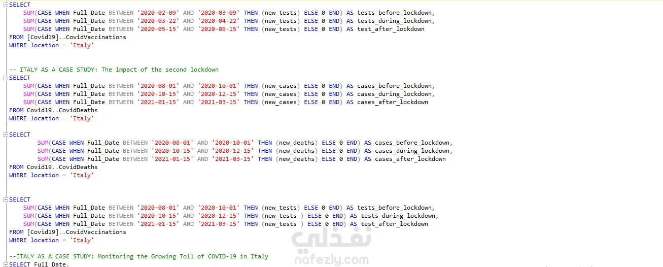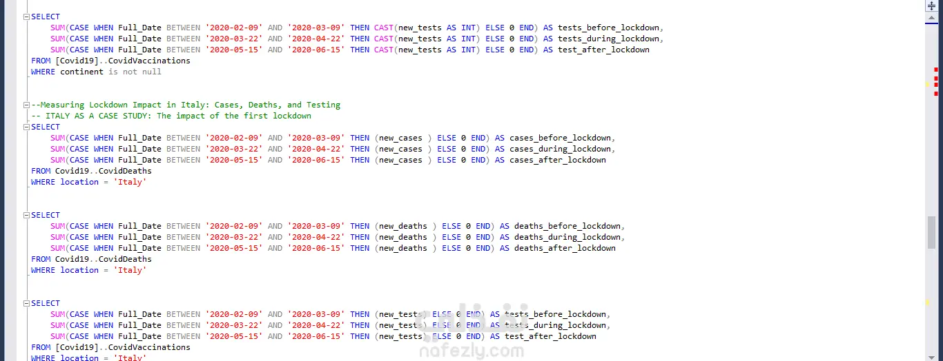 أجريتُ تحليلًا معمقًا لعدد الوفيات عالميًا بسبب جائحة كوفيد-19، ولحملات التطعيم، باستخدام برنامج Power BI و SQL (Advanced queries) للكشف عن أبرز الاتجاهات (Trends). كما نفذتُ دراسة مقارنة للحالات والوفيات قبل فترة الإغلاق وأثناءها وبعدها، والتي كشفت عن زيادات ملحوظة خلال فترات الإغلاق وأبرزت أثرها في مسار انتشار الوباء. وتم تحليل إيطاليا كدراسة حالة تفصيلية لتقييم فعالية هذه الإجراءات.