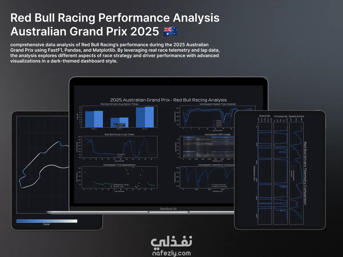 تحليلاً شاملاً لأداء فريق ريد بُل خلال جائزة أستراليا الكبرى 2025 باستخدام مكتبات FastF1 وPandas وMatplotlib. تم الاعتماد على بيانات السباق والتيلمتري الحقيقية لعرض رسومات بيانية متقدمة بتصميم داكن يوضح مختلف جوانب الأداء والخطة الاستراتيجية للسائقين.