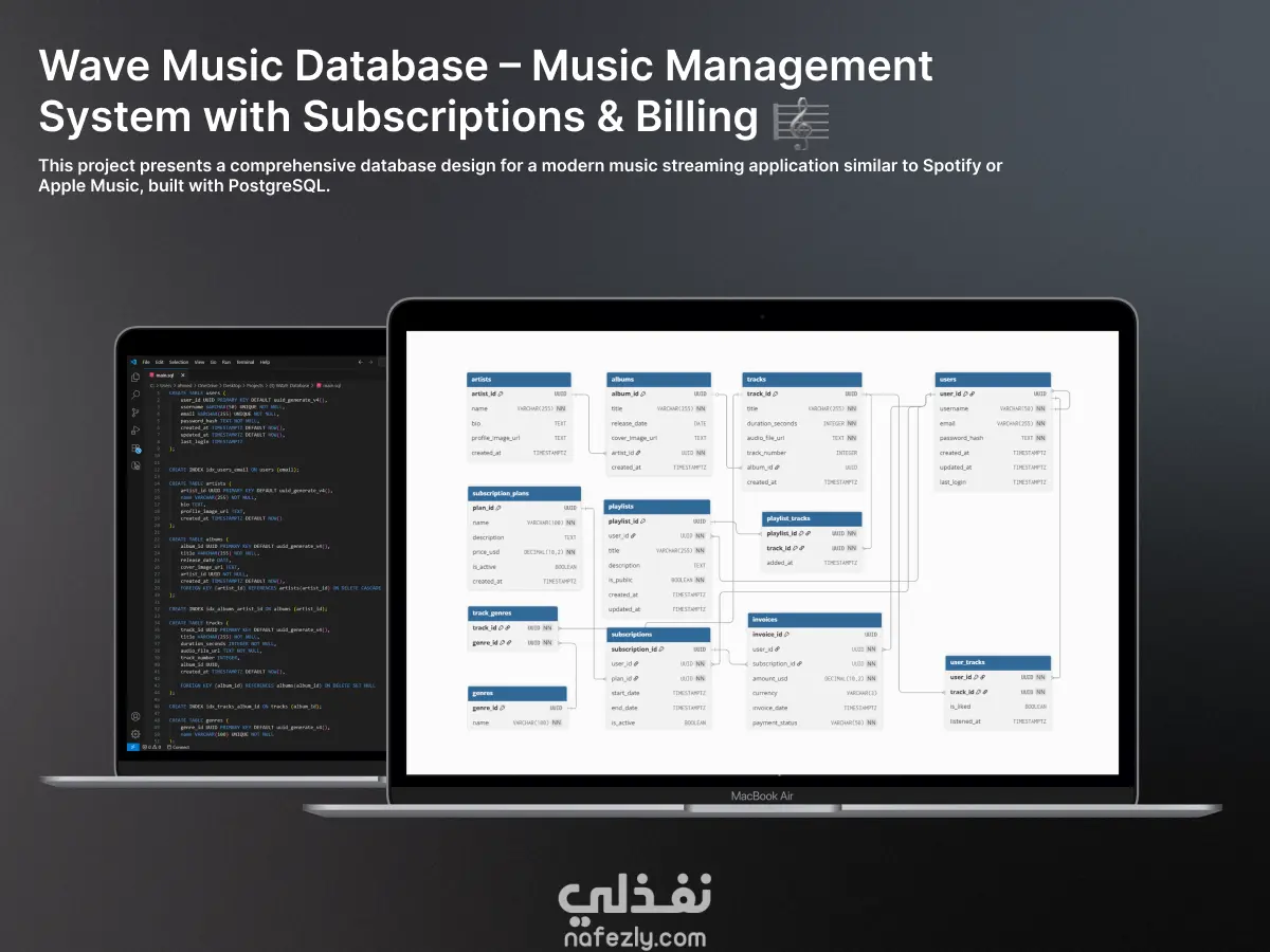 تصميم قاعدة بيانات متكاملة لتطبيق موسيقى يشبه Spotify أو Apple Music، باستخدام PostgreSQL.