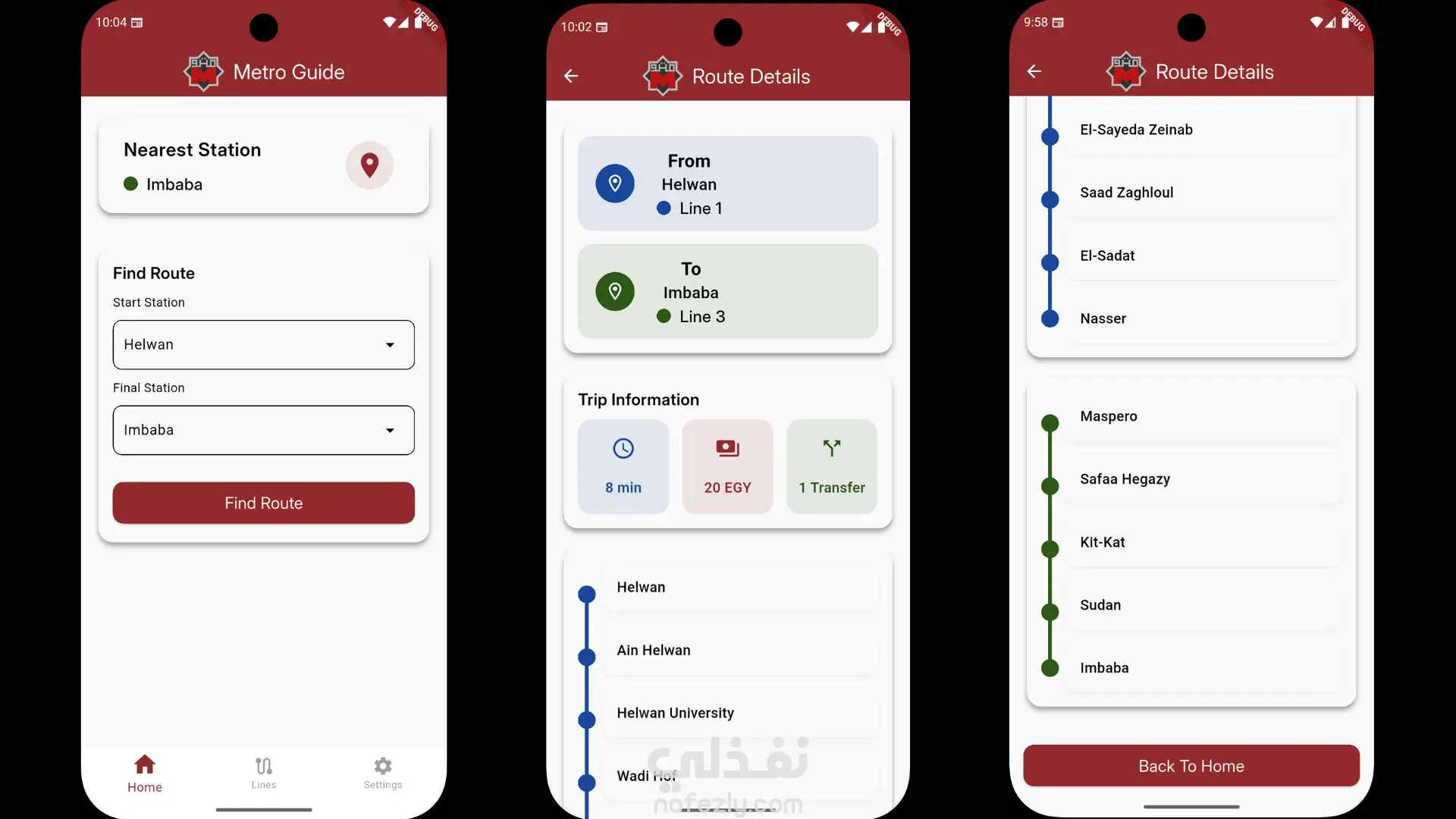صممت التطبيق ليكون مرشد ذكي للمستخدم يحدد له أقرب محطة بناءً على موقعه الحالي، ويعرض أفضل طريق للوصول لوجهته، مع عدد التحويلات، والوقت المتوقع للرحلة، وسعر التذكرة، وكل ذلك داخل واجهة بسيطة وسهلة الاستخدام.