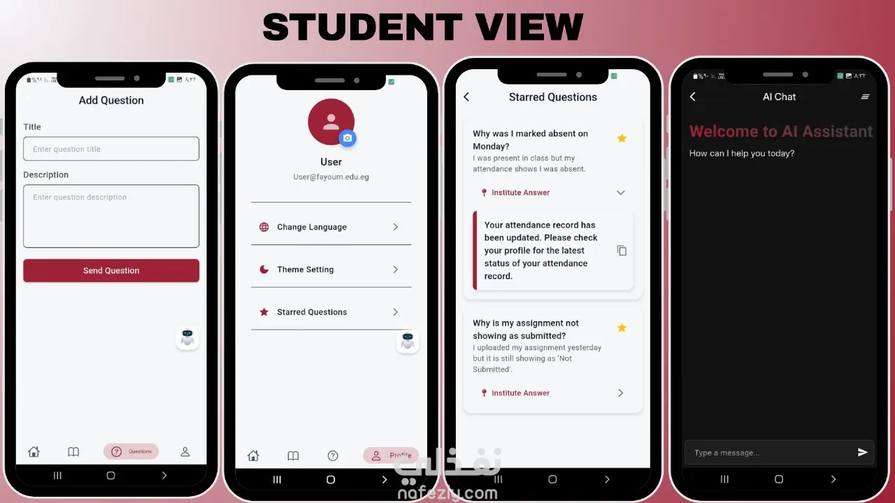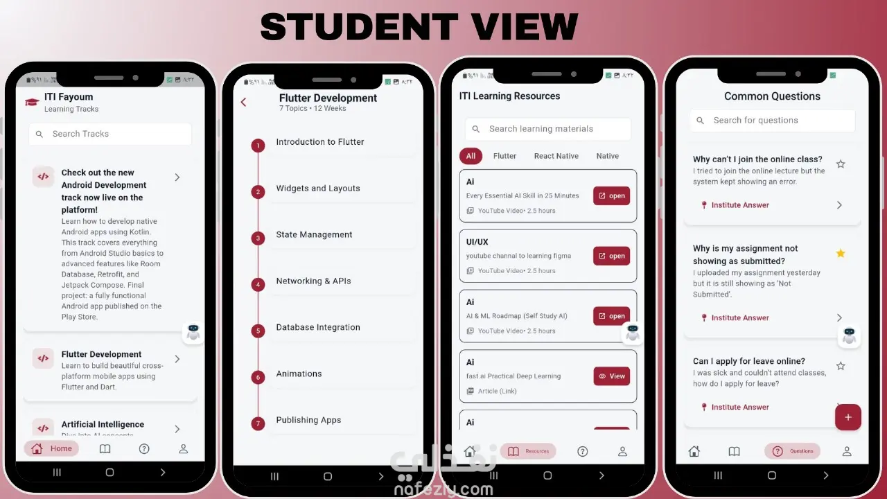 بالنسبة للطلاب، وفر التطبيق رؤية واضحة لجميع المسارات المتاحة، وموارد تعليمية منظمة، بالإضافة إلى وسيلة لطرح الأسئلة مباشرة على المدربين. ولتسهيل عملية التعلم، أضفنا ميزات مثل حفظ الأسئلة المفضلة، تصفح الأسئلة الشائعة (FAQs)، وحتى استخدام شات بوت للدعم السريع، وكل ذلك ضمن واجهة نظيفة تدعم تعدد اللغات وخيارات الوضع الفاتح والداكن.
