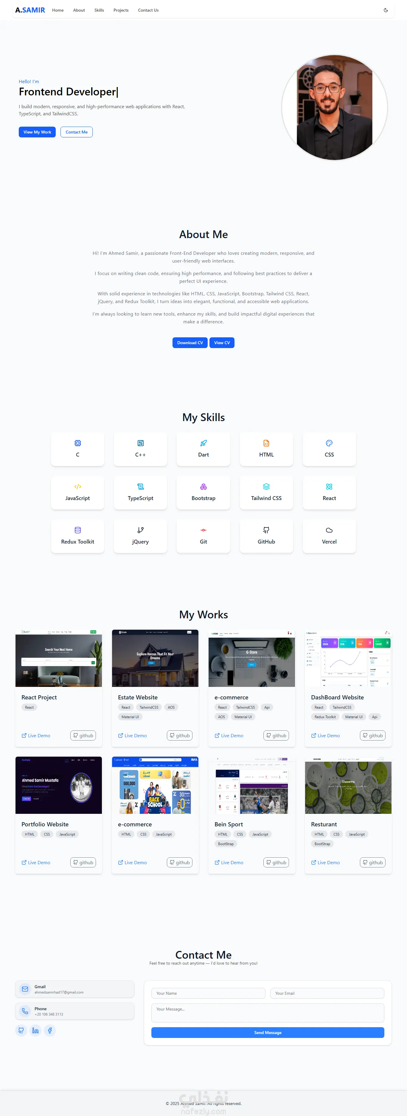 موقع بورتفوليو شخصي لعرض أعمالي ومهاراتي في مجال تطوير الواجهات الأمامية (Front-End Development). استخدمت في تنفيذ المشروع React.js , tailwind , shadcn/ui مع تطبيق معايير Responsive Design ليعمل الموقع بسلاسة على جميع الأجهزة. ركّزت في التصميم على البساطة، وسهولة التصفح، وإظهار الهوية الشخصية بشكل احترافي.