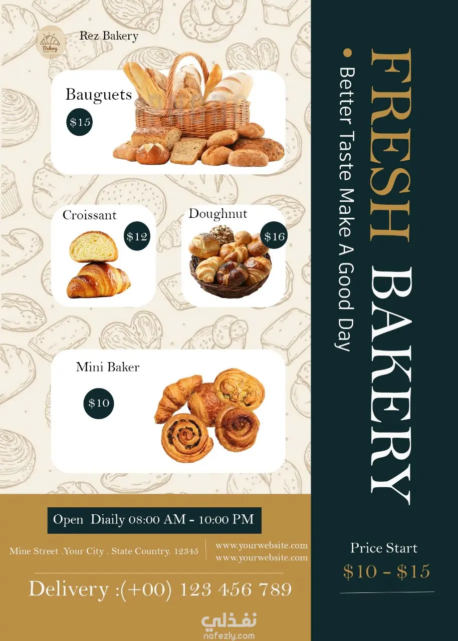 التصميم متناسق ويعكس طابع مخبز راقٍ يقدم منتجات طازجة.