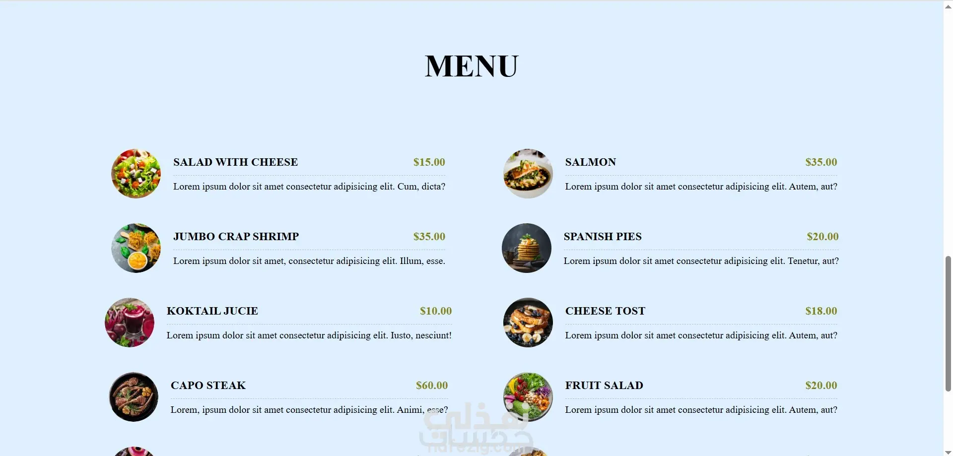 تصميم واجهة مستخدم (UI) لمطعم عصري، يركز على البساطة وسهولة الاستخدام. يحتوي التصميم على صفحة رئيسية جذابة مع صور للأطباق، قائمة طعام واضحة، وأزرار سريعة لطلب الطعام أو الحجز. الهدف من التصميم هو إبراز هوية المطعم بطريقة حديثة ومناسبة لجميع الأجهزة (Responsive Design